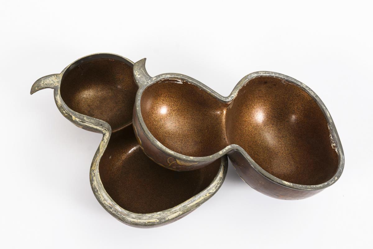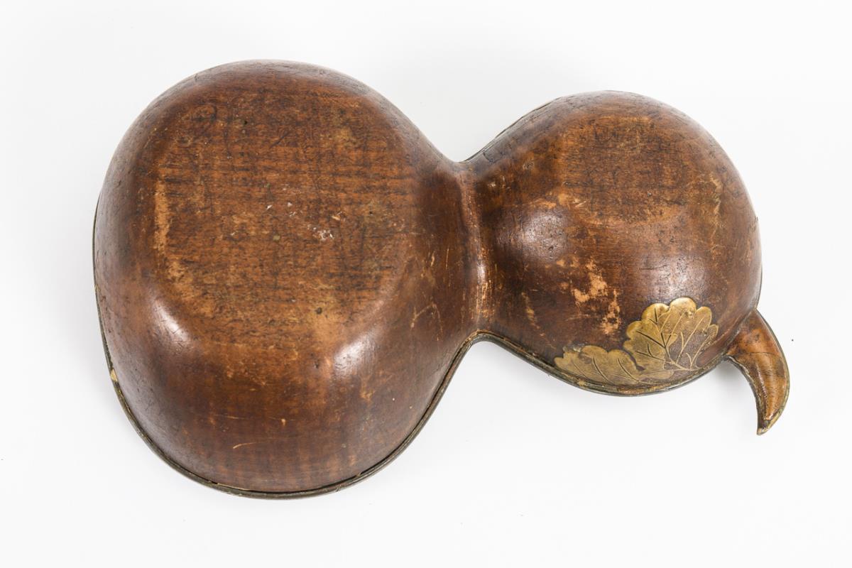 Zweiteilige Dose in der Form eines Doppelkürbisses. Innen mit Goldflitter-Lack verziert; Rand mit schmaler Zinnfassung. Oberfläche mit schwach reliefiertem Gold-Blattmuster. Schöne Alterspatina.