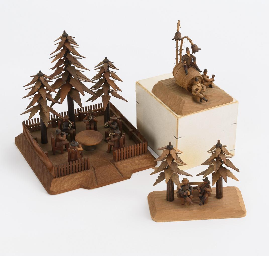 "Gartenkonzert" aus verschiedenen Edelhölzern (auf dem Karton einzeln genannt). / 2 Musikanten unter Bäumen. / 3 trinkende Zwerge mit Weinfass. Alle im Originalkarton.