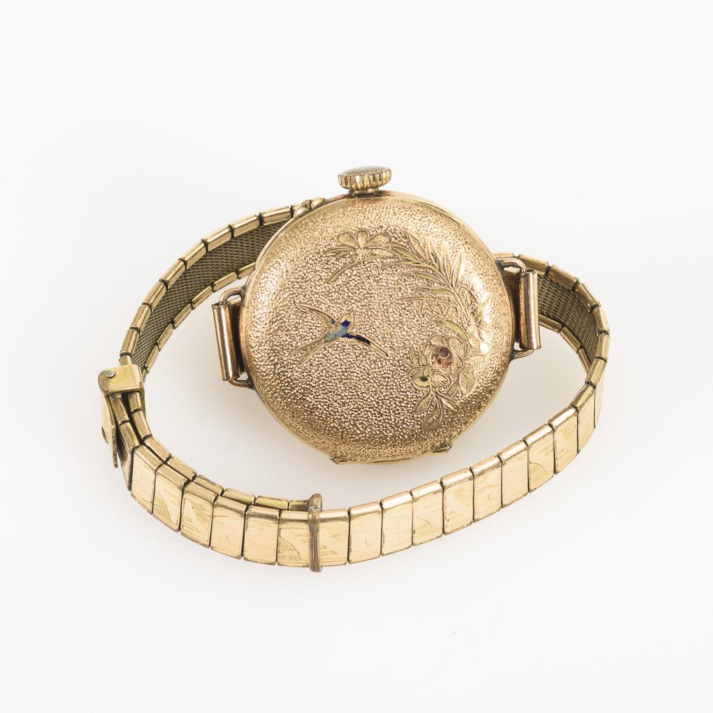 Gekörnt ziseliertes, offenes Goldgehäuse mit rückseitiger Floralgravur und Vogelmotiv, teils farbig emailliert. An jünger ergänztem Doublée-Schiebearmband mit Art-déco-Design, Tempo Patent, Andreas Staub gepunzt, L ca. 20 cm. Bereibungen, teils fehlendes Email, partiell minimal gedellt, Armbandschieber reparaturbedürftig.