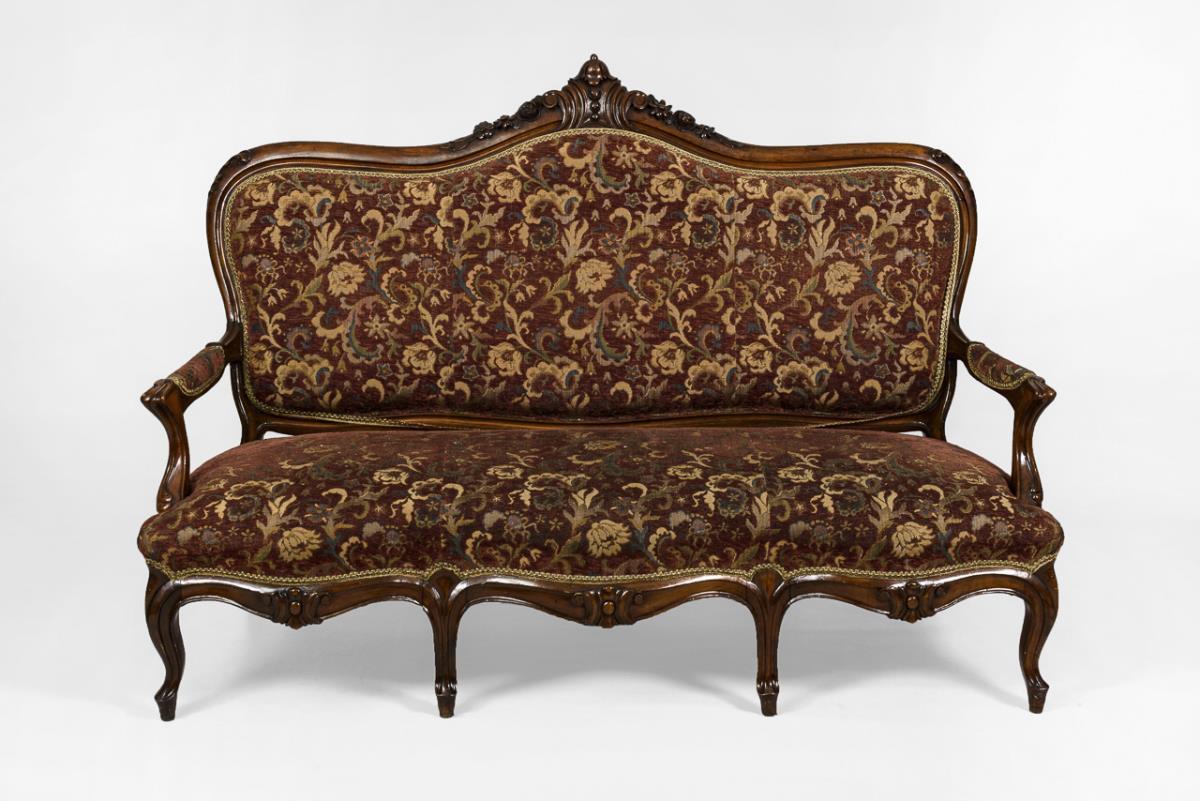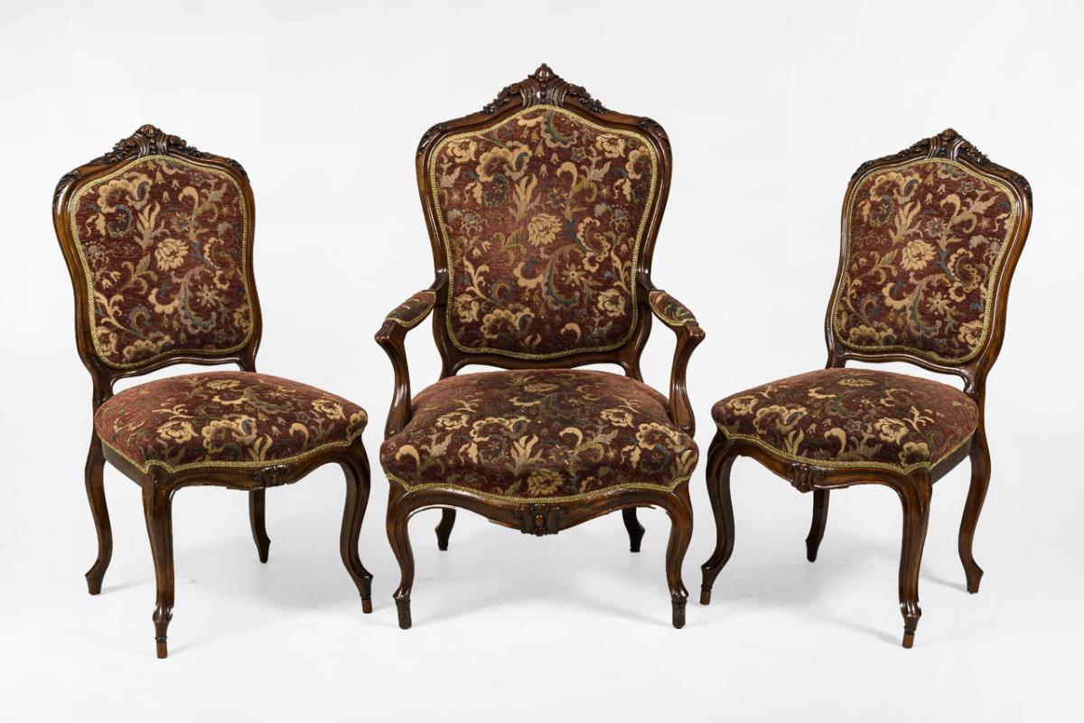 Stiltypisch geschwungenes 4-teiliges Ensemble mit Sofa, 2 Polsterstühlen und 1 Armlehnstuhl, bekrönt mit üppiger Pflanzenschnitzerei. Weinroter Samtbezug mit farbig abgesetzten Rankenornamenten. Wohnfertig restauriert, Polster und Bezug ergänzt.