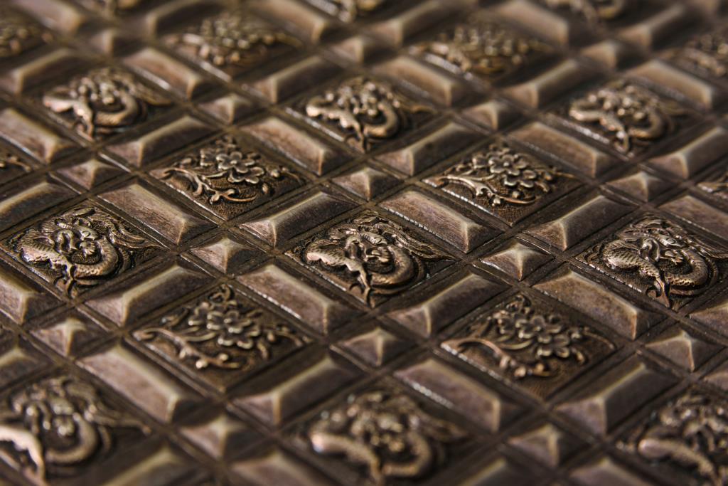 Reliefierte Dose mit Blüten- und Drachenmotiven, innen Wurzelholz. Gebrauchsspuren.
