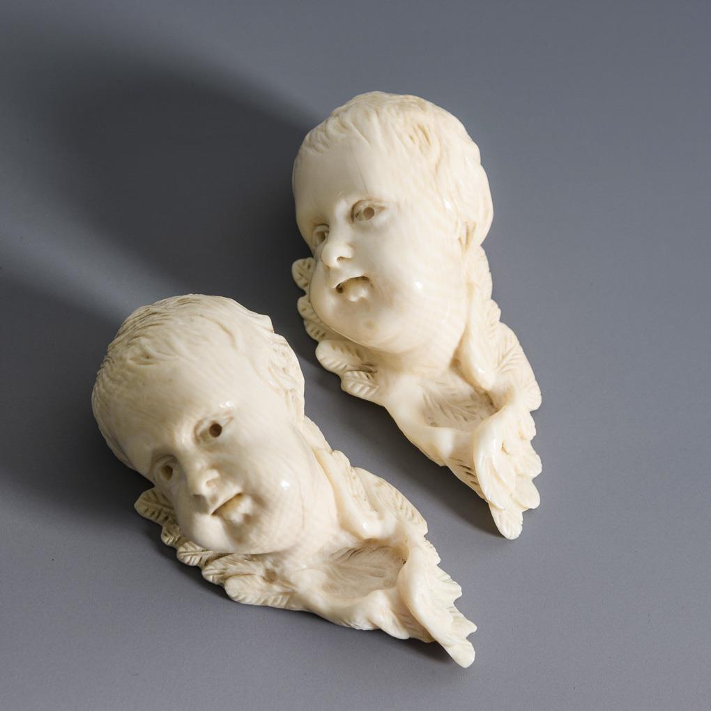 Konvolut Elfenbein: 1 Porträt im Ebenholzrahmen + 2 Puttenköpfe.