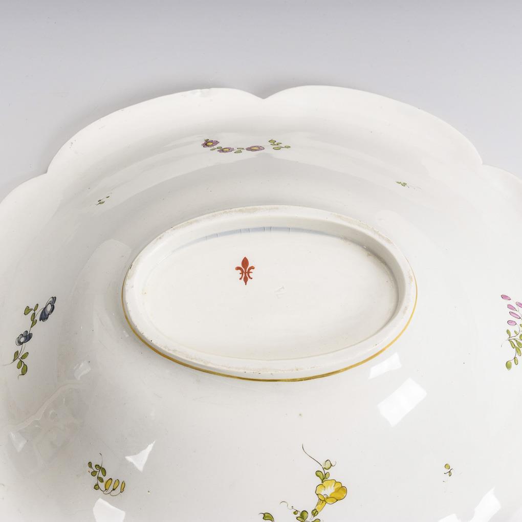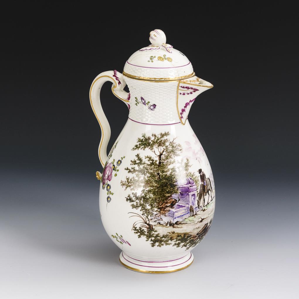 Birnkanne mit spitzer Schneppe, Altozier und Ohrenhenkel, Deckel mit Blütenknauf, H 31 cm. Ovale Schale mit geschweiftem Korbrand, L 39,5 cm. Bemalung mit pittoresken Landschaften und Staffagefiguren sowie Blumenbuketts. Alters- und Gebrauchsspuren, partiell Defekte, Deckel geklebt, unterer Henkelansatz retuschiert.