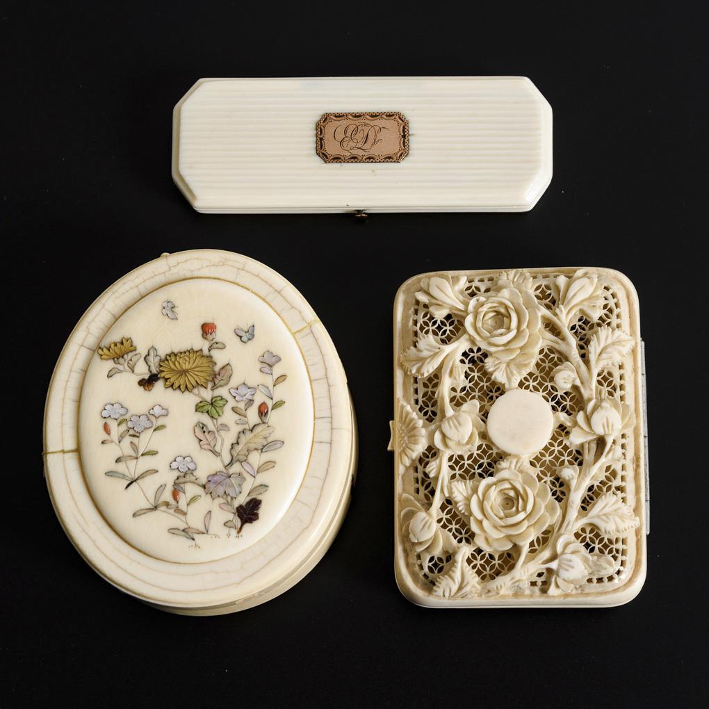 Ovale Dose mit teils reliefartigen floralen Einlagen und Appliken in Insektenform. / Scharnierdeckel und Boden der Quaderdose mit Rosenzweigen über mosaikartig durchbrochenem Hintergrund (Zigarettenetui aus Dieppe?). / Längliche Dose mit Riffelung und Rotgoldkartusche: Monogramm "ED". 2x haarrissig, davon 1x geklebt, minimale Fehlstellen.