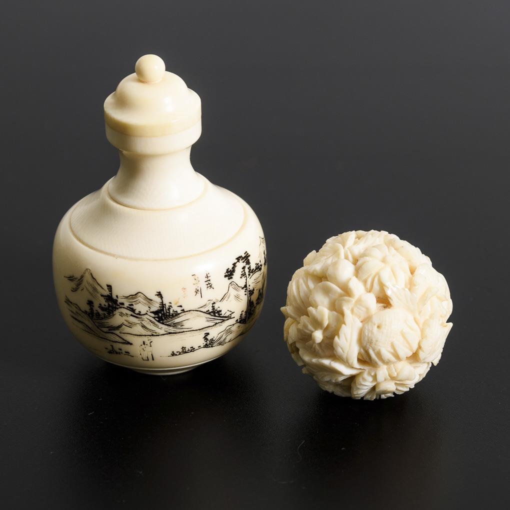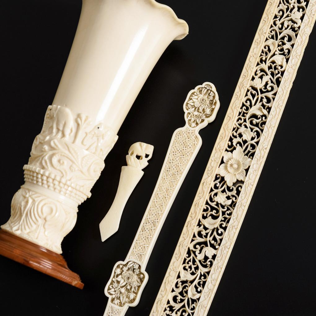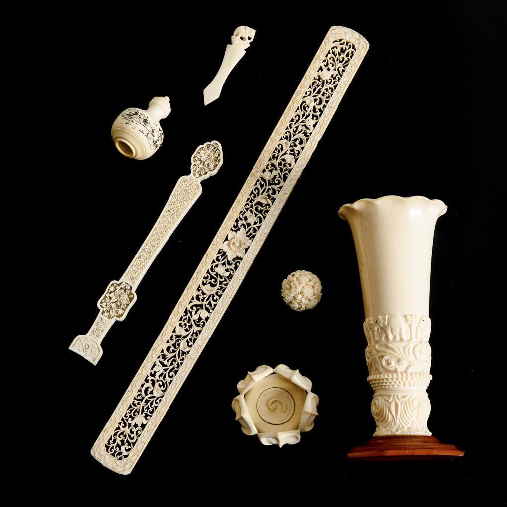 Langes Zierelement mit feiner À-Jour-Schnitzranke. Fächergriff (?) mit fein geschnitzten Figurenszenen und Blumen. Snuffbottle mit geschwärzter Landschaftsgravur und asiatischem Schriftblock. Vase mit Blattranken und Elefantenfries. Seitenmarkierer mit Elefant. Floraler Kugelanhänger. Krabben-Zierelement. Stirnseiten beim Zierelement beschliffen, 1 Spitze bei Seitenmarkierer fehlt, Kleine Fehlstellen.