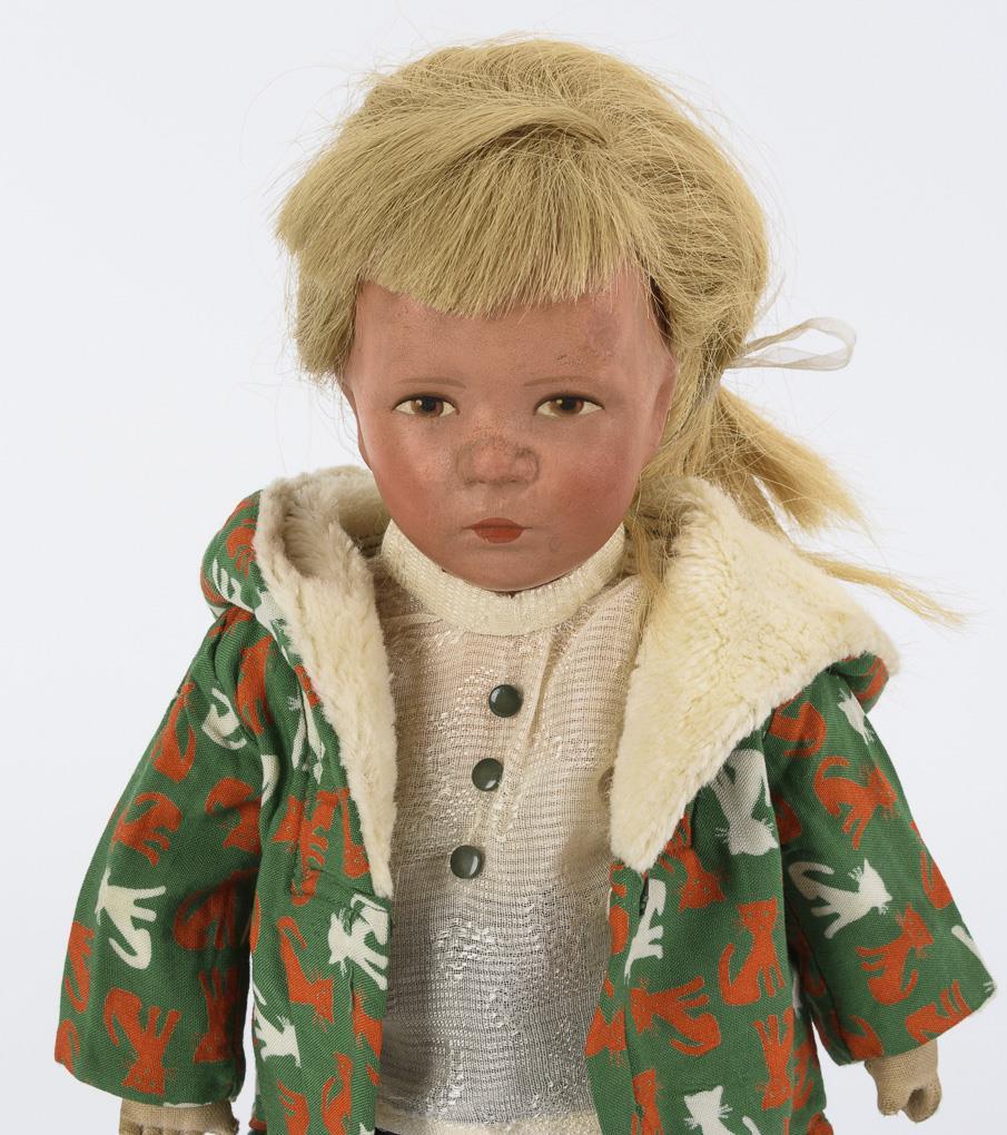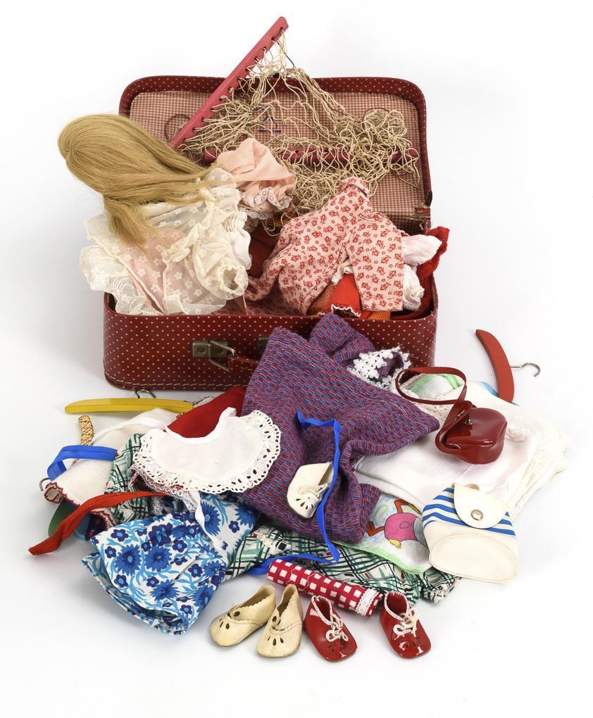 Kunststoffkopf, gemalte braune Augen, blonde Echthaarperücke. Heller Stoffkörper mit rosa Halslatz und Schlenkerarmen, Beine mit Scheibengelenken. Schwarze Hose, Winterjacke mit Kapuze. Dazu roter Kinderkoffer aus der Zeit und zahlreiches Zubehör: Ersatzperücke, Puppenhängematte, Handtaschen, Kleidung etc. Bespielt, Kopf an Stirn, Nase und 1 Ohr retuschiert.