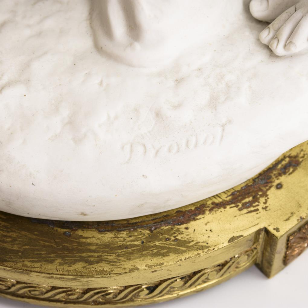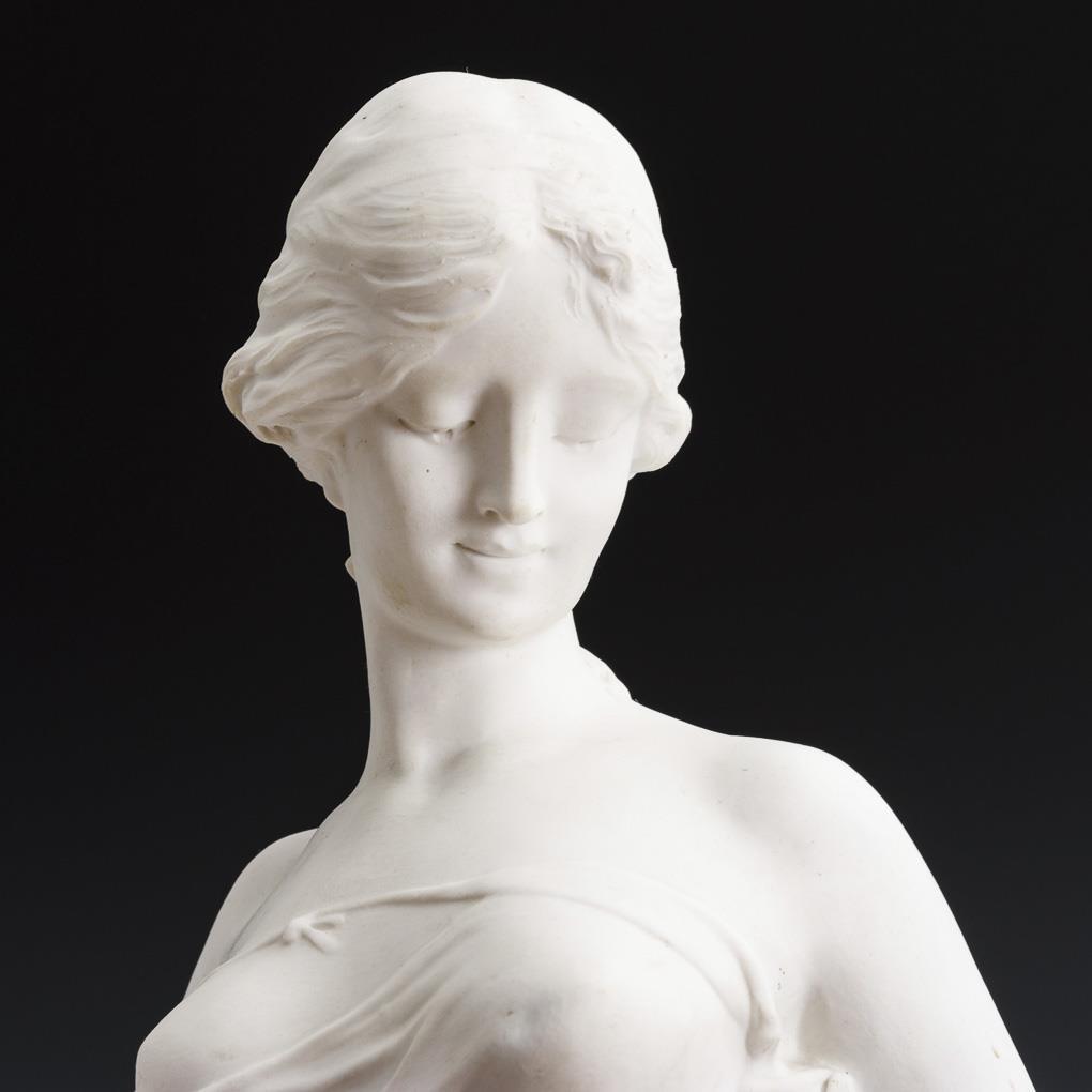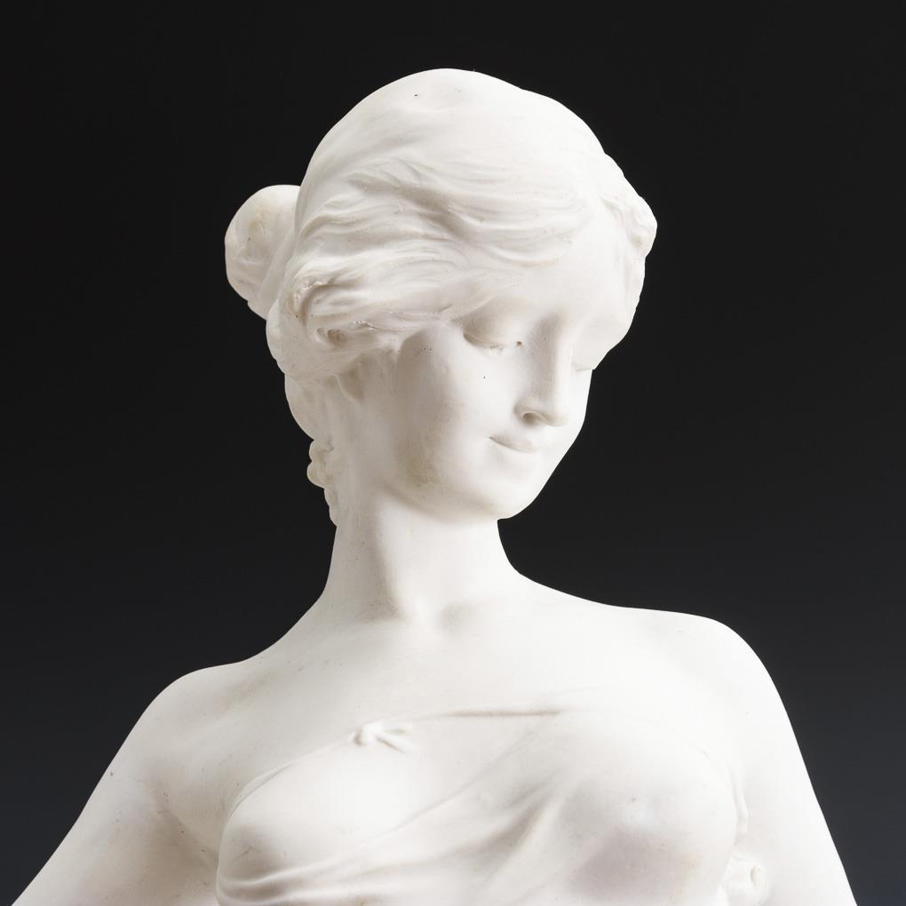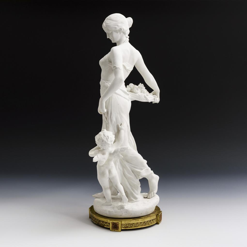 Junge Frau mit Rosenkorb, zu ihrer Linken ein Amorknabe laufend. Nach einer Plastik des französischen Bildhauers Edouard Drouot (1859 - 1945). Auf Bronzesockel. 1 Puttenflügel, rechte Hand und linker Zeigefinger der Dame restauriert.