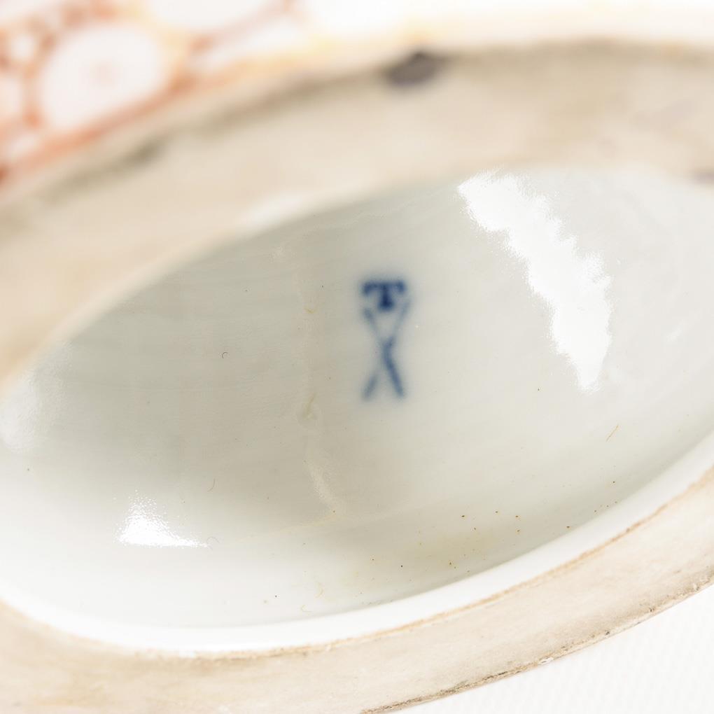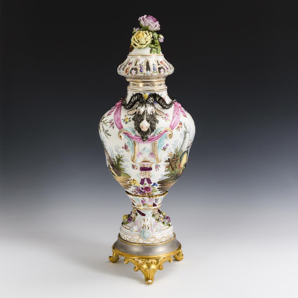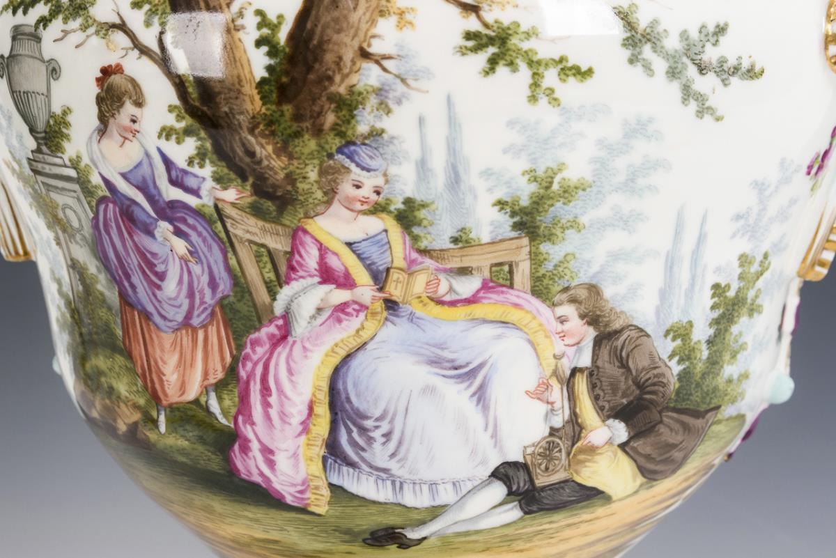 Balustervase mit zwei Widderkopfhandhaben und durchbrochenem Deckel mit drei Rosen als Deckelknauf, Rundfuß mit Blütenbelag. Beidseitig die Darstellung einer galanten Szene. / Dazu ergänzter silber- und goldstaffierter Sockel. Bestoßungen am Belag und an den Deckelrosen, Sockel ergänzt, 1 Widderohr repariert.