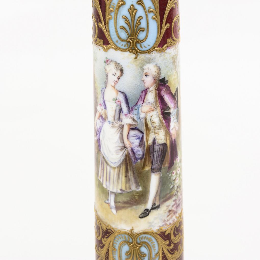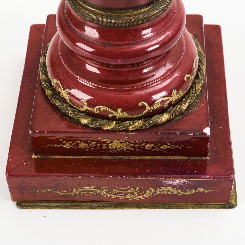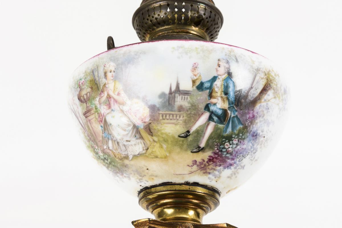 Auf getrepptem, quadratischem Fuß ein säulenförmiger Schaft mit Bronzekapitell, halbkugeliger Tank und Metallmontierung. Bordeauxroter Fond sowie cremefarbener und hellblauer Teilfond, Goldreliefmalerei sowie farbig gemalte galante Szenen. Ohne Schirm und Zylinder, 1 Ecke bestoßen, geklebter Ausbruch an der Säule, Metallmontierung mit Lötstellen.