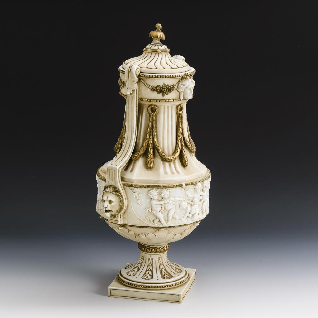 Im klassizistischen Stil gearbeitete Vase mit einem umlaufenden Puttenreliefband am Korpusansatz, Lorbeerfestons, zwei Henkeln, Frauenmaskaronen und Knaufdeckel, Rundfuß, quadratische Plinthe. Knauf geklebt, minimaler Goldabrieb.