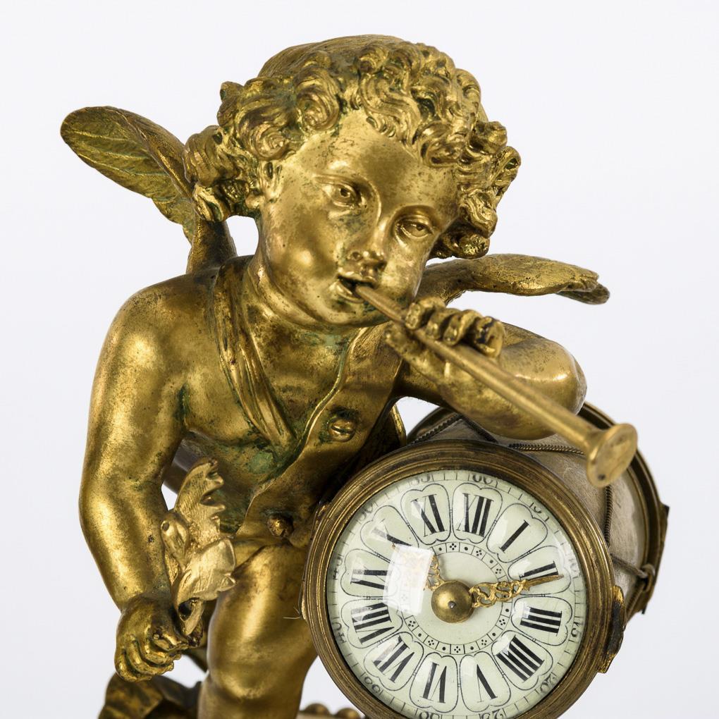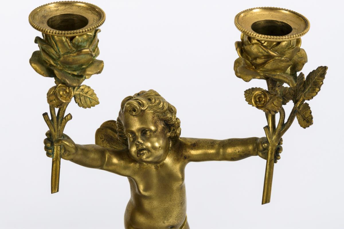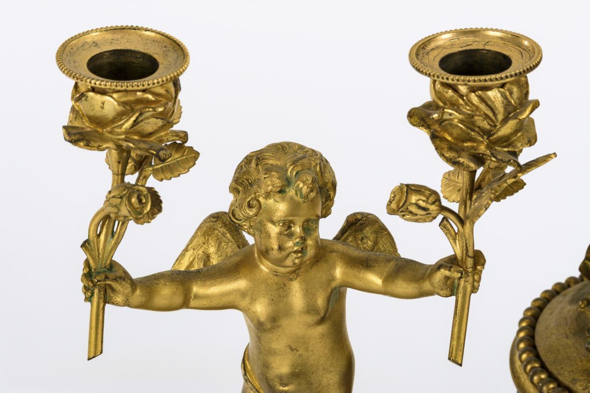 Fanfarender Putto mit kleiner Uhrentrommel auf zylinderförmigem Sockel und quadratischem Postament. Dazu ein Paar 2-flammige Leuchter mit plastischem Puttenschaft und Rosentüllen. Leichte Alters- und Gebrauchsspuren.