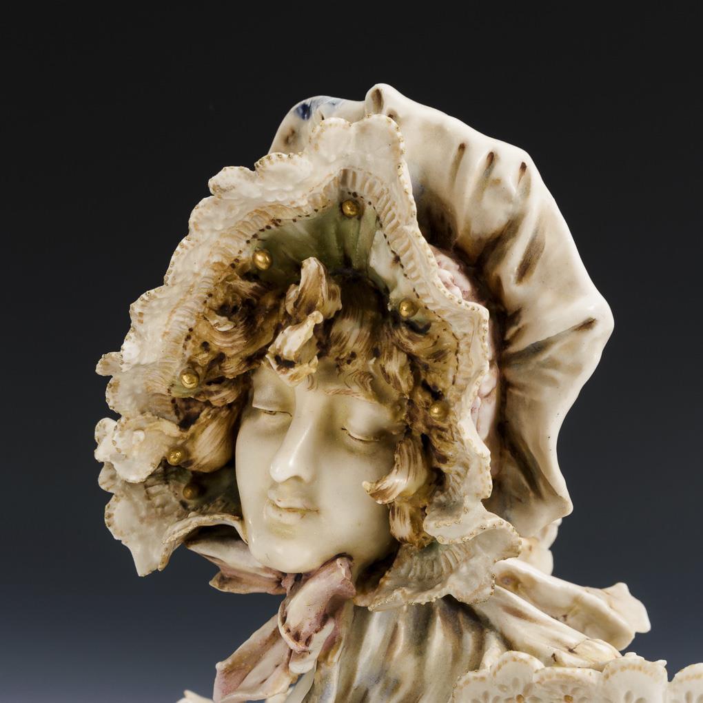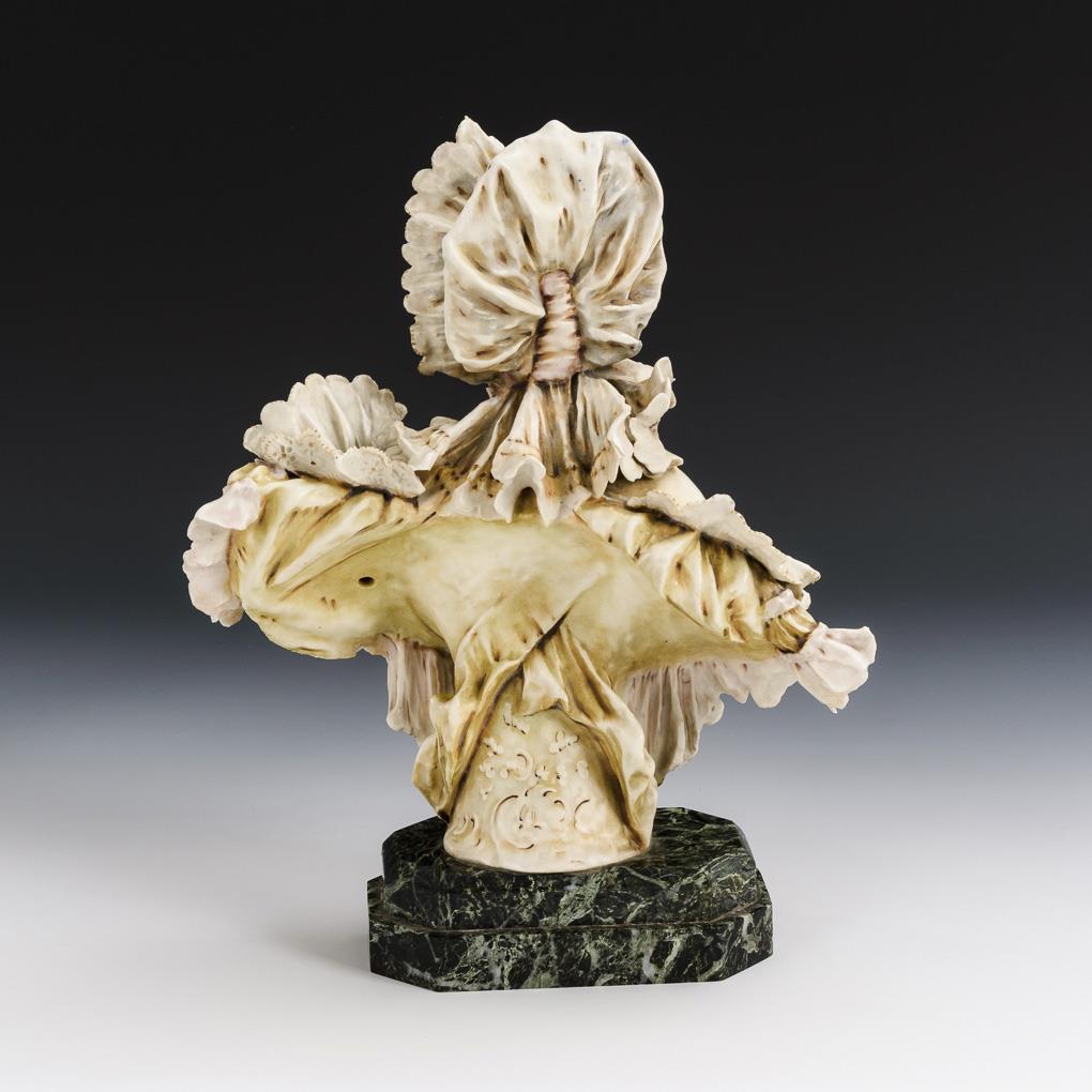 Büste einer jungen Dame in üppiger Rüschenkleidung, auf Steinsockel. 2 Bestoßungen an den Rüschen.