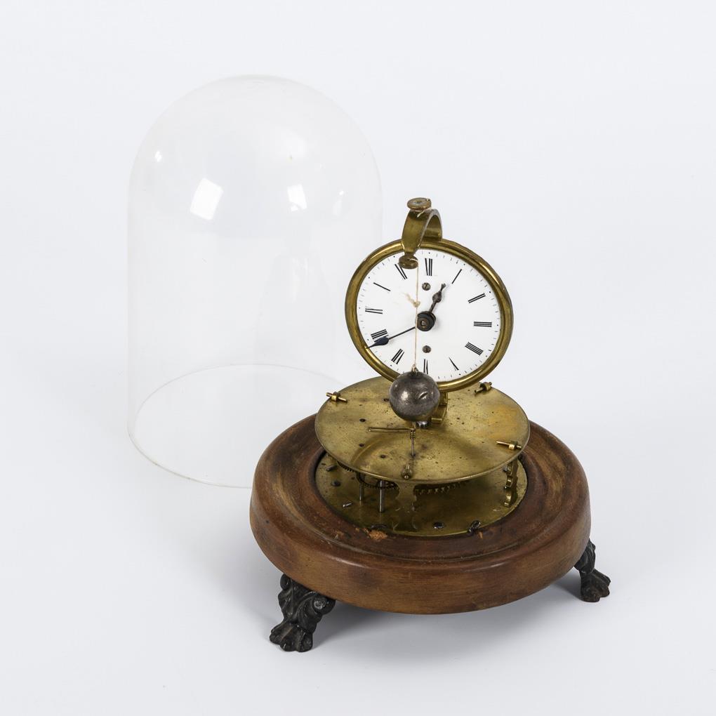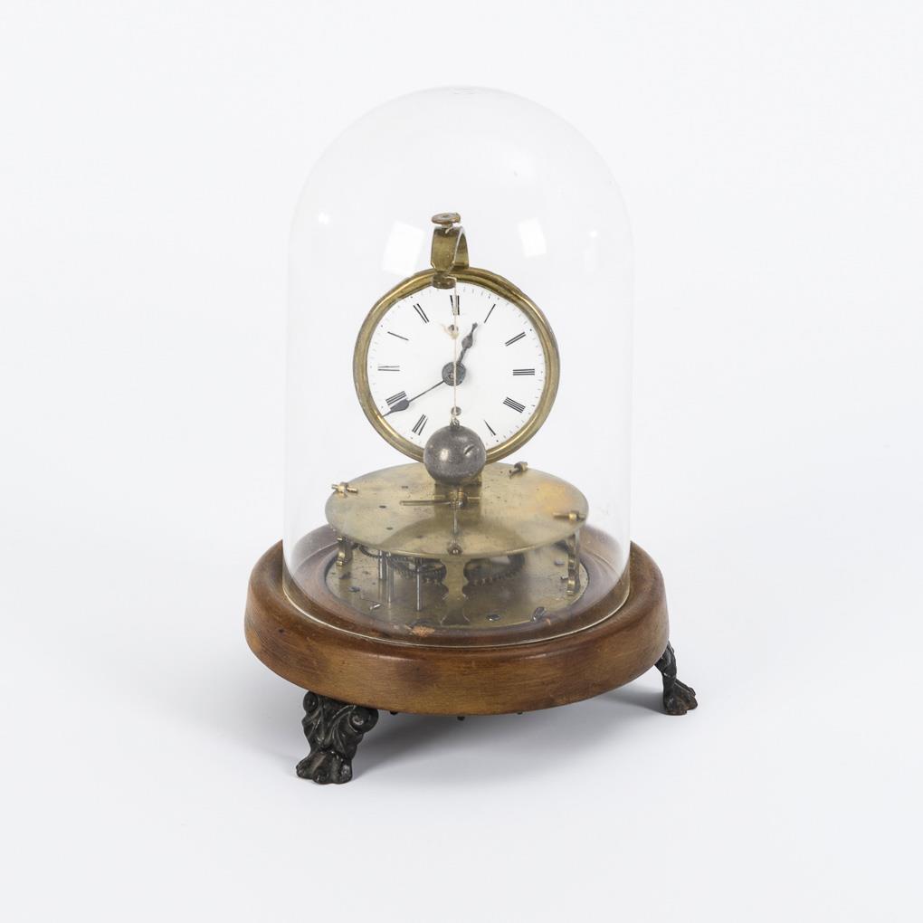Runder Buchensockel auf 3 blattreliefierten Eisenfüßchen. Messingplatinen, geprägt "PAT. AUG. 1855 JULY [...] mit Räderwerk, bodenseitiger Eisenrad-Handaufzug, Werk überholungsbedürftig. Aufgesetztes Zifferblatt mit frontseitig hängender Bleikugel als Werkantrieb (Faden provisorisch repariert). Ergänzter Kunststoff-Glassturz. Alters- und Gebrauchsspuren, Defekte.