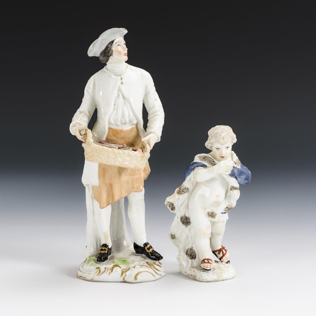 1x Pariser Ausrufer mit Kochlöffeln. / 1x Putto mit Schlittschuhen und Mantel als Allegorie des Winters. Chip und Brandfehler am Putto.