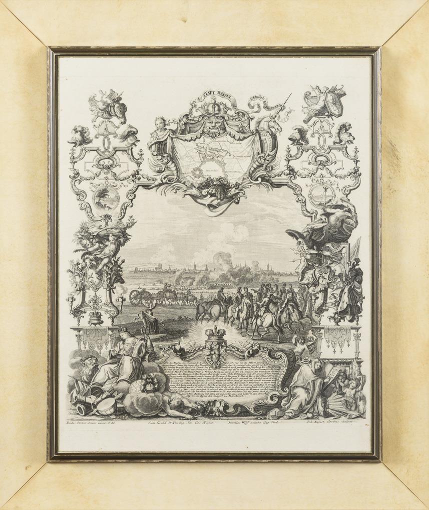 Dekorative Darstellung der Belagerung der französischen Festung Lille im Jahr 1708 im Zuge des Spanischen Erbfolgekrieges, im Banner bezeichnet "Die Ruhmwürdige Eroberung der Stadt Ryssel als des Schlüssels zu Franckreich", kleinteilige, figürliche Rahmung mit zahlreichen allegorischen Szenen und vogelperspektivischem Plan mit eingezeichneter Belagerung; nach einem Gemälde von Paulus Decker (1677 - 1713).