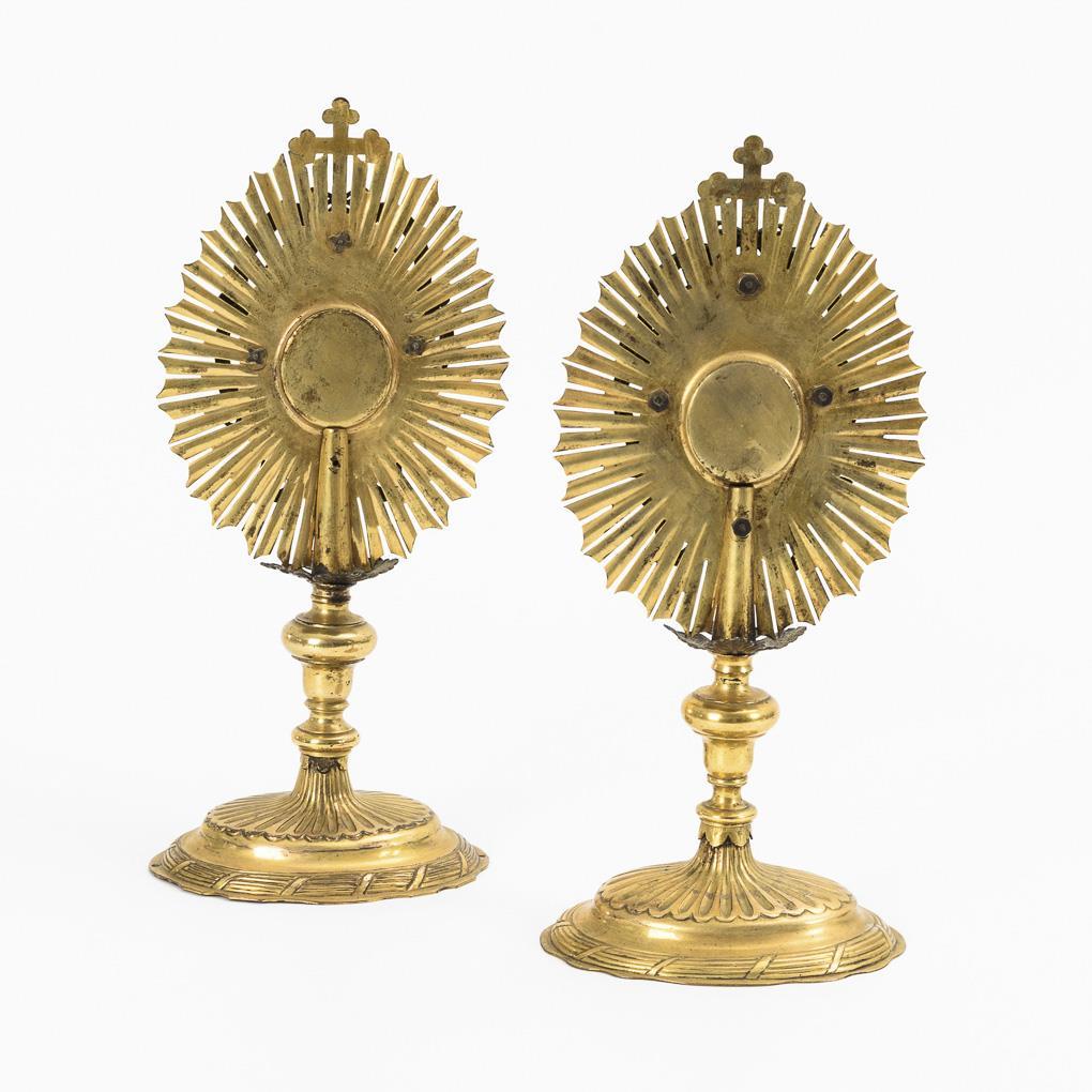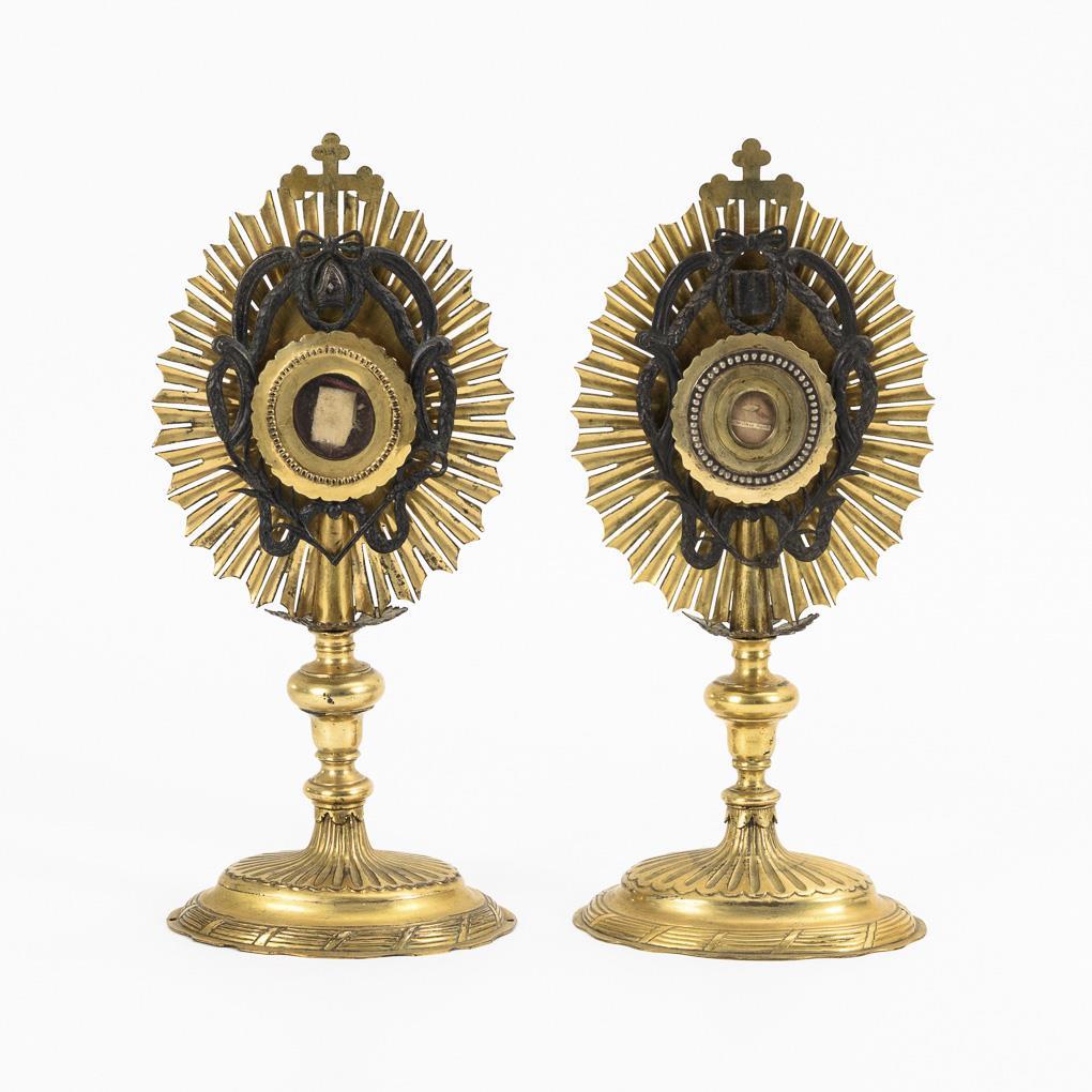 Fast identisch gearbeitete Reliquienbehälter in Form von Strahlen-Monstranzen. Je verglaste Theca; 1x mit Reliquie und Cedula für den Apolstel Matthias. 1 Reliquie fehlt, je wenige Alters-/Gebrauchsspuren.