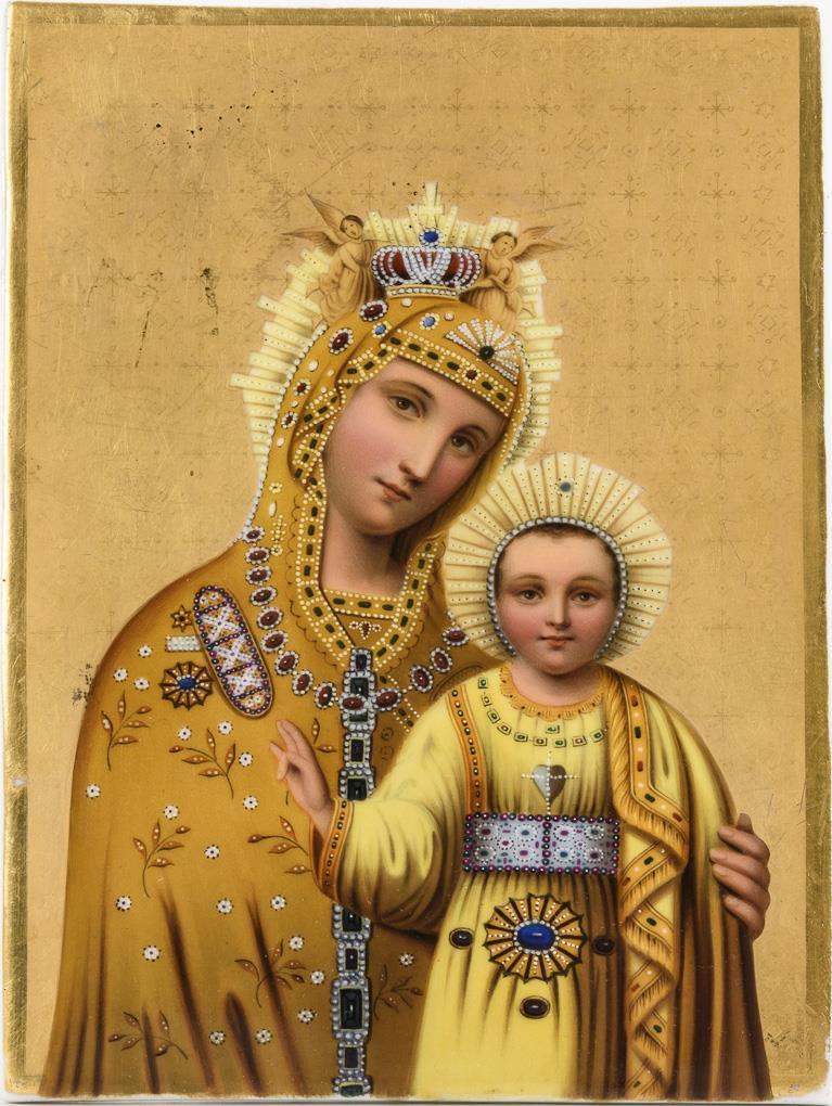 Rechteckige Platte, vor einem Goldfond die Darstellung der Gottesmutter mit segnendem Jesuskind. Einige Emailpünktchen fehlen, partiell Kratzspuren.