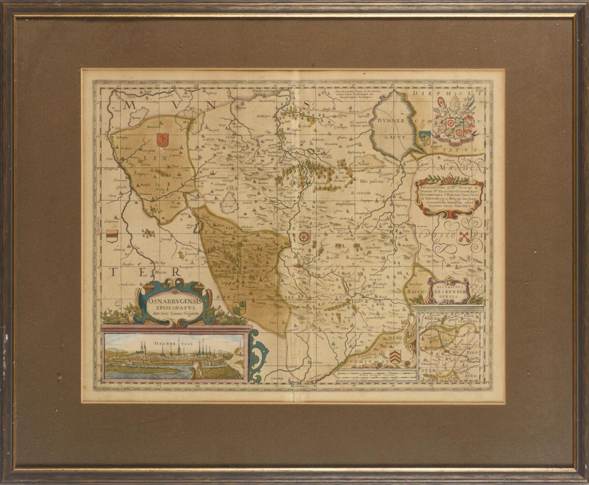 Detaillierte historische Landkarte des Bistums Osnabrück mit Rollwerk-Titelkartusche und Miniaturansicht von Osnabrück "Osenbrvgge" aus der Zentralperspektive, Insetkarte von Reckenberg, Widmung an Bischof Franz von Wartenberg und Wappen, bezeichnet "Osnabrvgensis Episcopatvs. Auctore Ioanne Gigante". Bugfalte, Blatt gebräunt.