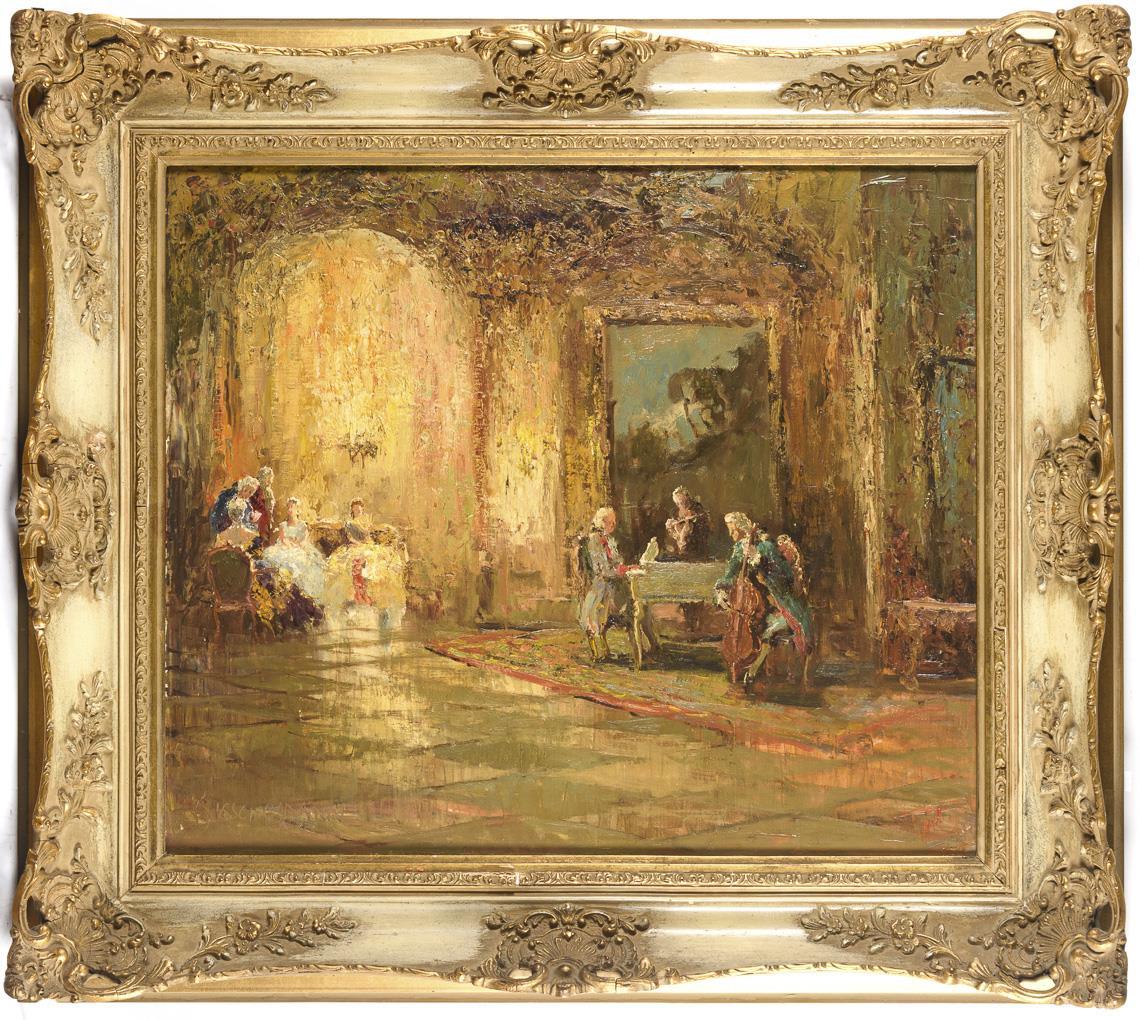 Rokoko-Gesellschaft mit edlen Damen und Herren sowie spielenden Musikern.