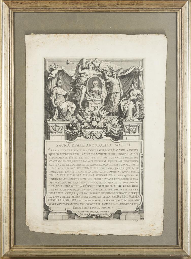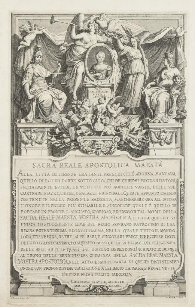 Widmungsplatte mit Porträt der Maria Theresia von Österreich (1717 - 1780) und detaillierten weiblichen Personifikationen der Gerechtigkeit, zu Florenz, Religion und des Ruhmes; Widmung in italienischer Sprache "Sacra Reale Apostolica Maesta [...]" von Andrea Gerini; nach einer Zeichnung von Giuseppe Zocchi, Widmungsseite aus dessen Werk "Ansichten von Florenz", 1744. Randbereich stärker stockfleckig und geknickt.