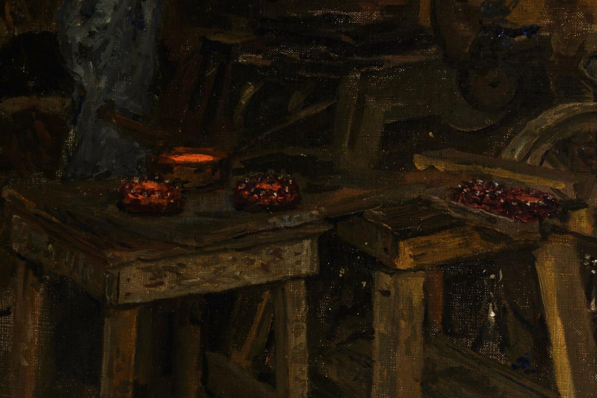 Arbeiter am Feuer und in der Hitze der Schmiede sowie Glasbläser beim Bearbeiten des glühenden Glases. Je leichte Altersspuren.