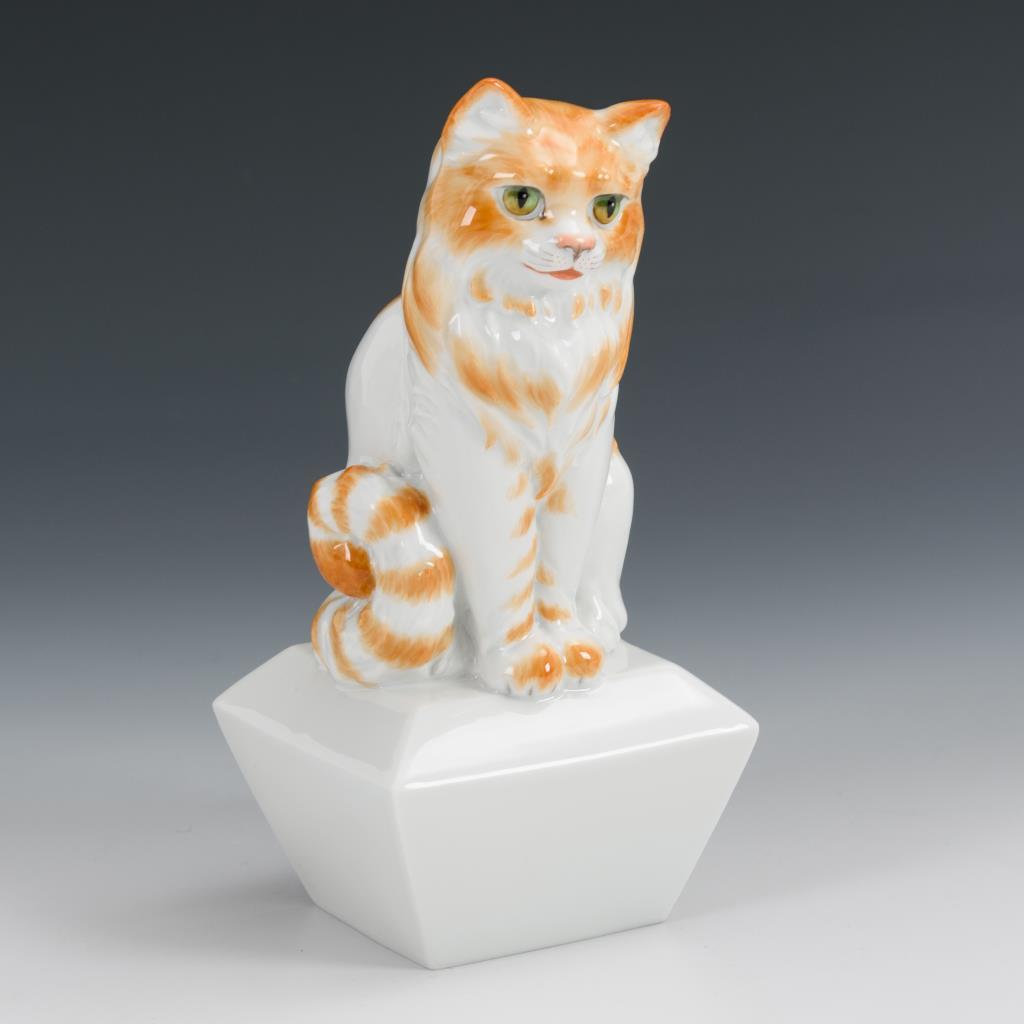 Auf einem konischen Sockel sitzende Katze.