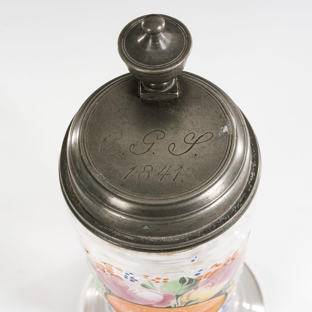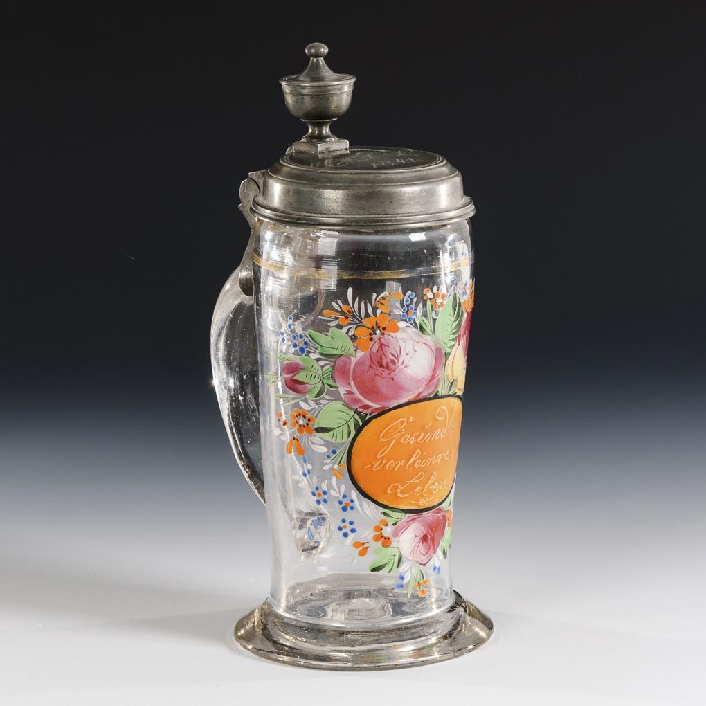Leicht konischer Krug mit Bandhenkel und zinnmontiertem Scharnierdeckel, Abriss. Schauseitig ein Blumenbukett mit einer orangen Kartusche, darin die Widmung "Gesundheit verlängere dein Leben.". Spannungsriss am unteren Henkelansatz, Gold berieben.