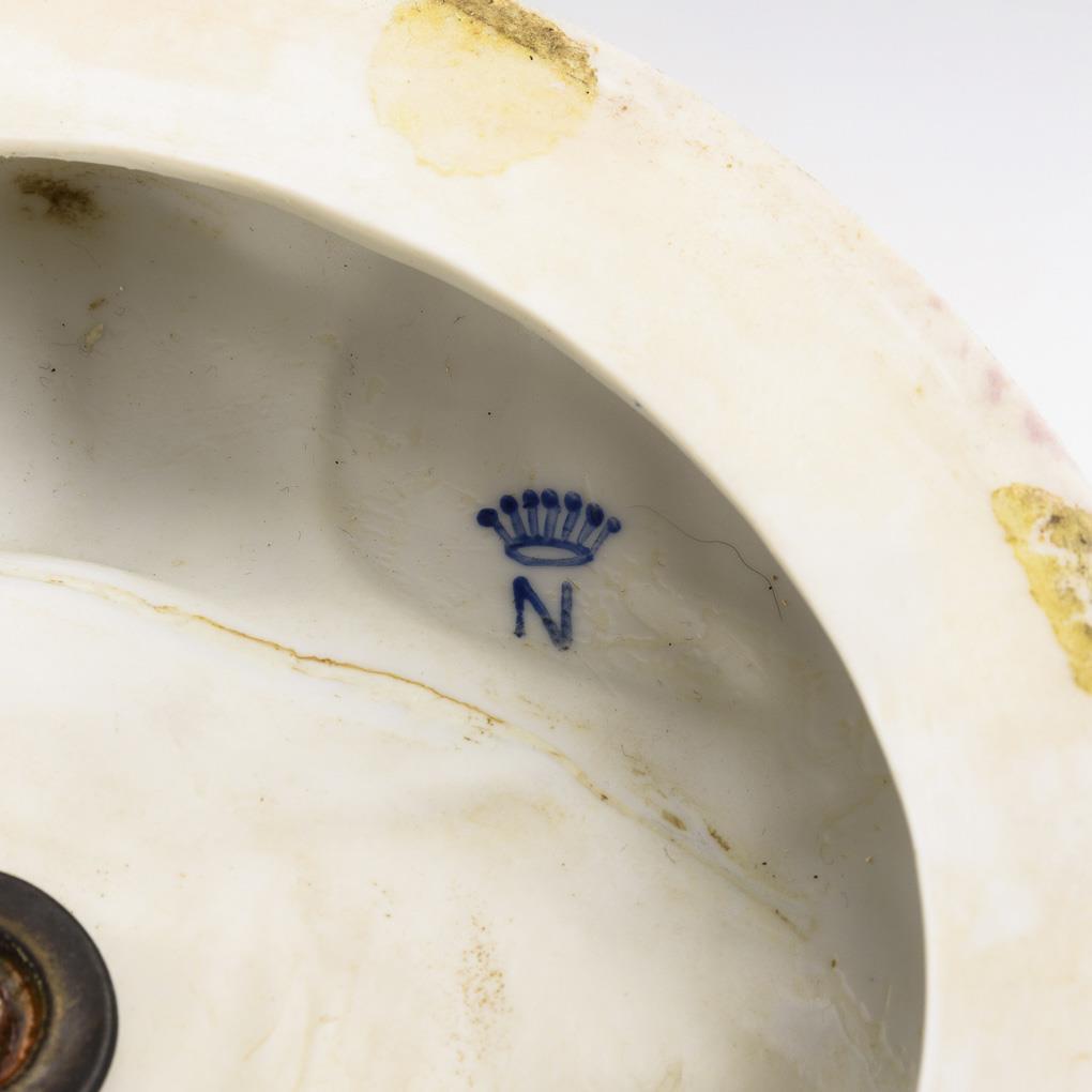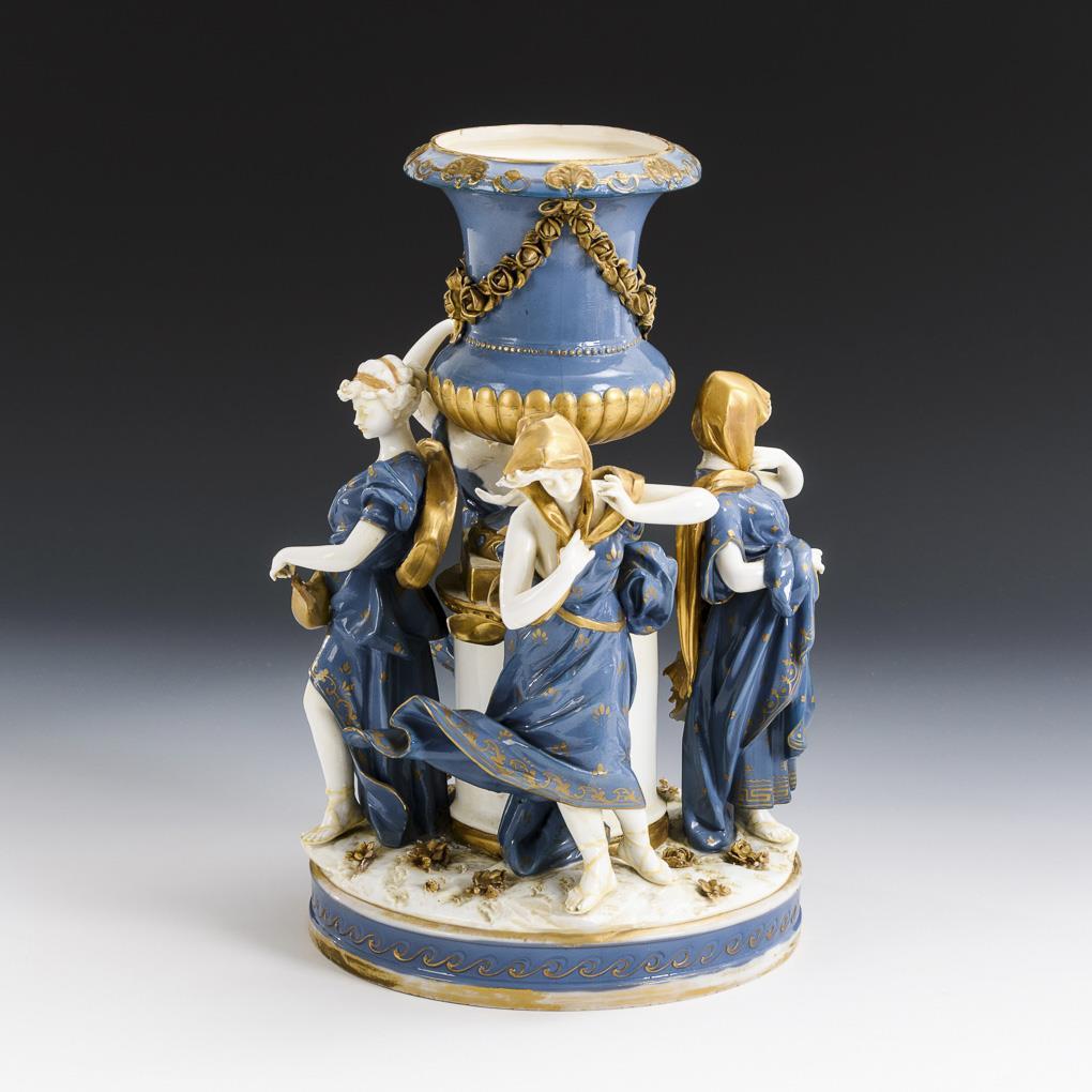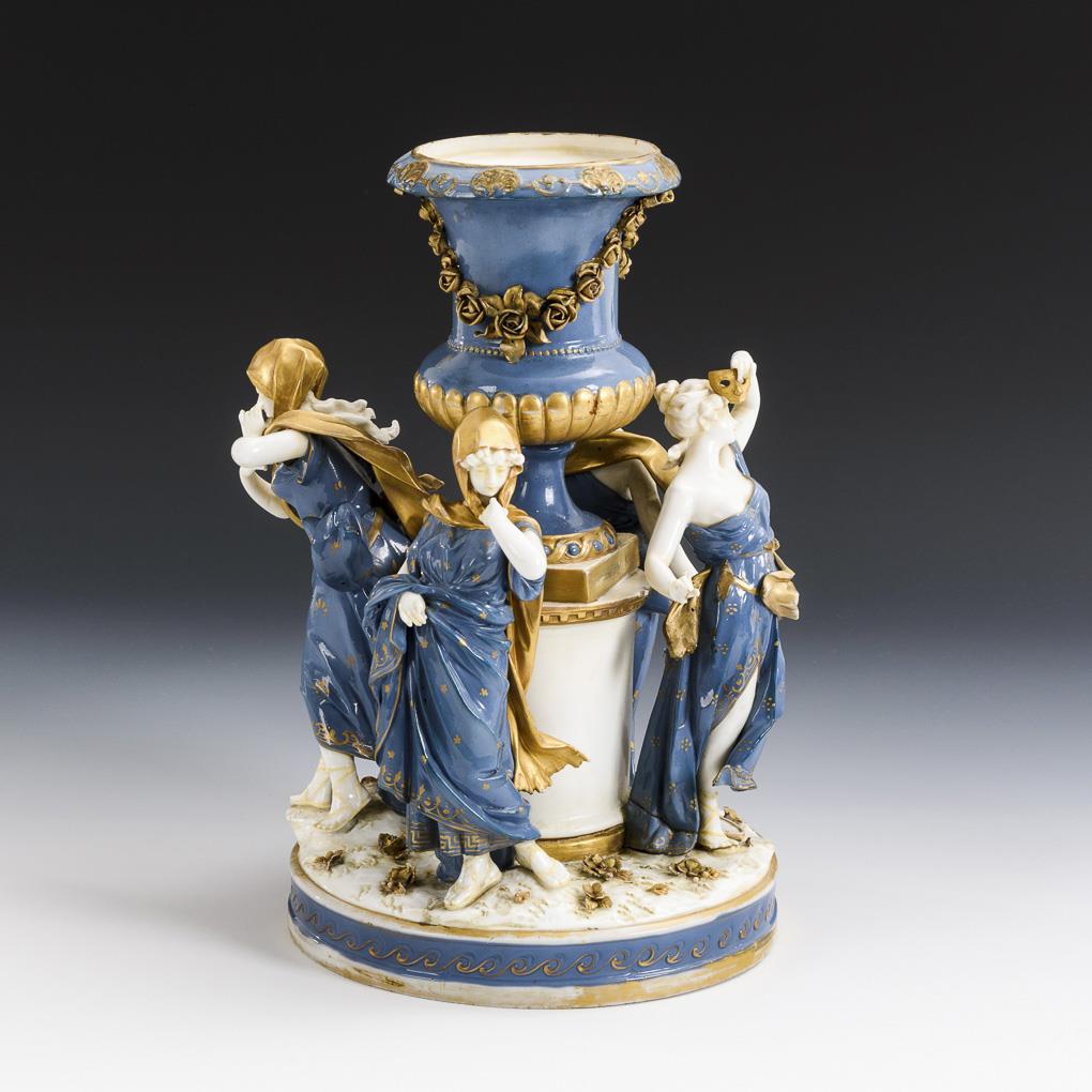 Auf einem Postament stehende Kratervase mit Rosengirlande, um das Postament vier allegorische Frauenfiguren. 1 Figur geklebt und restauriert, 1 Finger und einige Blüten minimal bestoßen.
