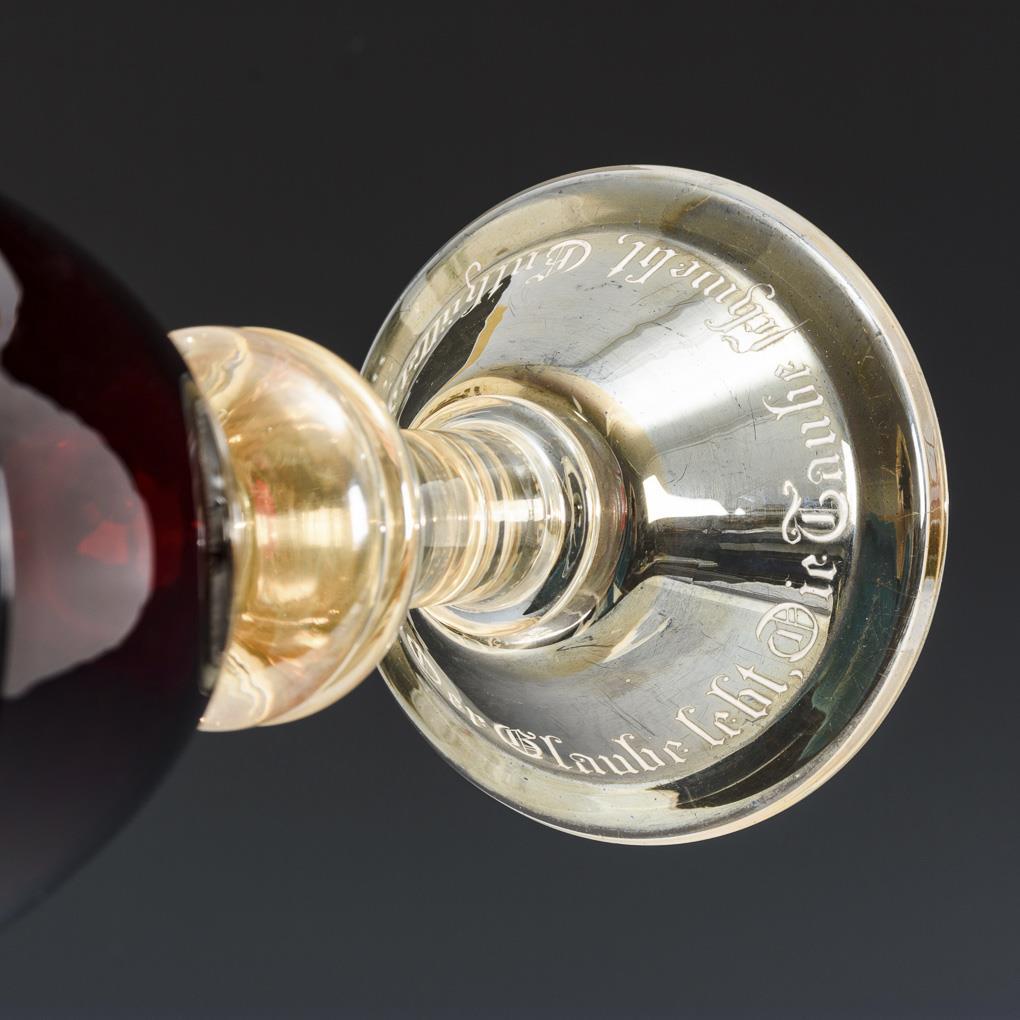 Farbloses Glas mit rubinrotem Innenfang an der Kuppa, teils lüstriert. H 25 cm.