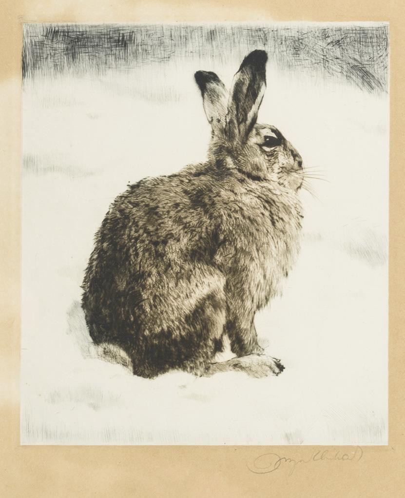 Hase im Schnee, Platte: 23,5 x 20 cm, gerahmt & hinter Glas: 45 x 34,5 cm, Randbereich mit Wasserflecken | Rotkehlchen auf Distel, Platte: 27,5 x 20,5 cm, gerahmt & hinter Glas: 41 x 31,5 cm, mit Lichtschaden.