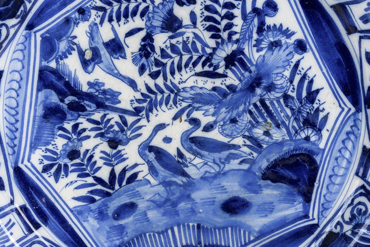 Schwerer Fayence-Wandteller mit asiatisierendem Dekor in Art der Wanli-Kraakteller.