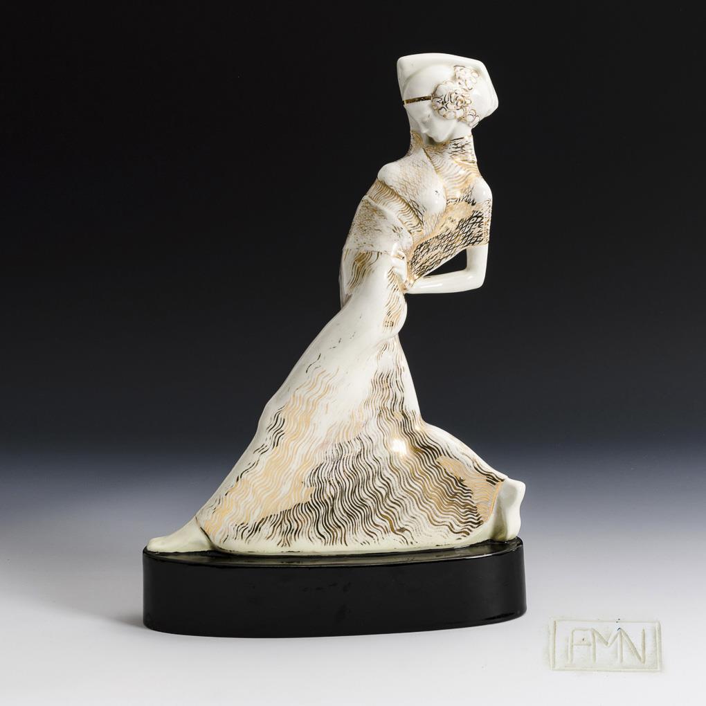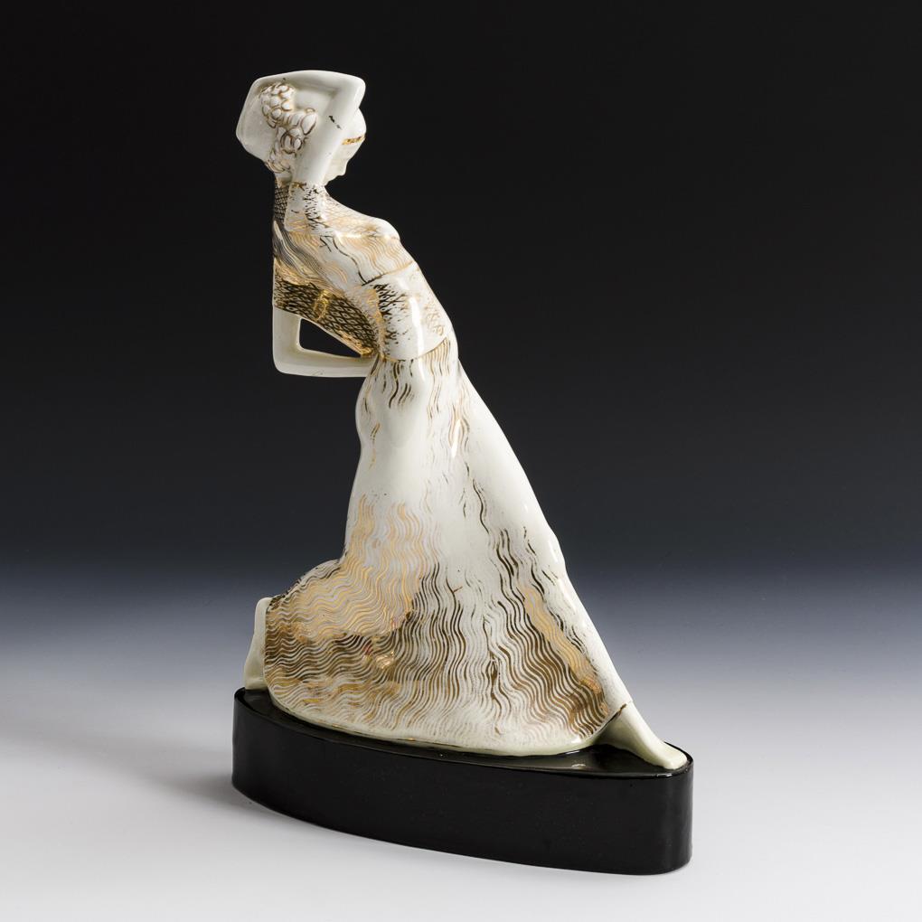 Elegant schreitende Dame, auf schwarzem Ovalsockel. Gold leicht berieben.