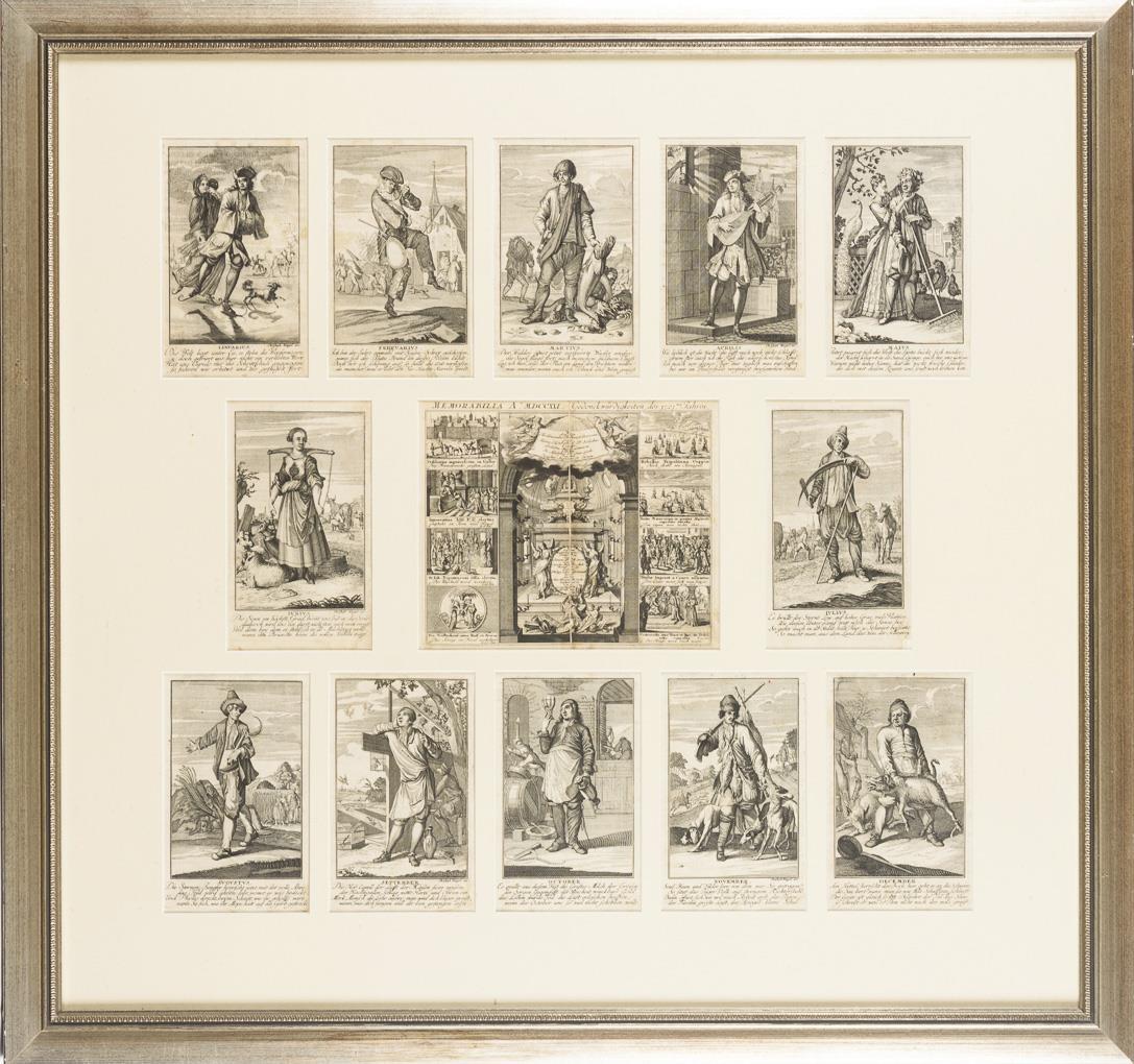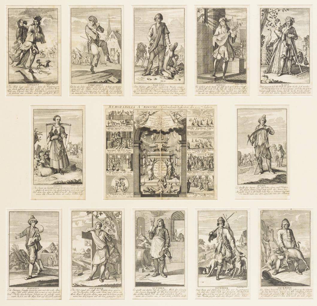 12 Kalenderblätter mit humorvollen, dem jeweiligen Monat entsprechenden Reimen und Monatsbildern mit für jeden Monat typischen Tätigkeiten, 1 zusätzliches Blatt mit "Gedenckwürdigkeiten des 1721ten Jahres". Etwas griffspurig, verschmutzt und leicht stockfleckig.