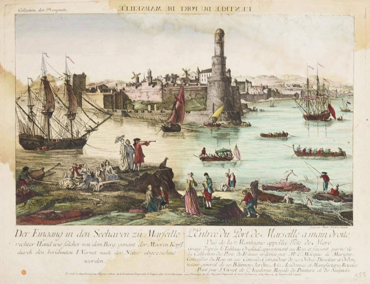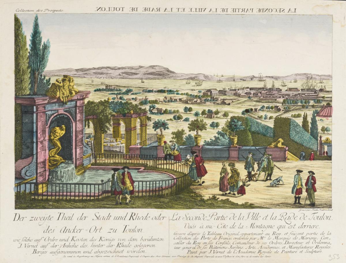 14 Guckkastenbilder mit unterschiedlichen Sujets - Balthasar Friedrich Leizelt: " Der Alte See=Hafen zu Toulon [...]" | "Vue de la Maison de Nothumberland à Charing Cross de Londres" | "Der Eingang in den Seehaven zu Marseille [...]" | "Vue du Pont de Westminster du Côte du Nord de Londres." | "Der Hafen zu Marseille [...]" | "Der Hafen zu Marseille [...]" | "Der Eingang in den Seehaven zu Marseille [...]" | "Vue de Londres sur du côte du Sud-Est depuis la Tour jusqu au Pont de Londres." | "Vue de l'Hôtel du Lord Maire qui comprend la Facade, et le Côté Occidental de Londres." | "Der zweyte Theil der Stadt und Rhede oder des Ancker=Ort zu Toulon." | "Der erste Theil der Stadt und Rhede oder des Ancker=Ort zu Toulon." | Georg Balthasar Probst: "Vue de l'Est du Pont et Nouvel-Arsenal de Kingiston sur l'Hull" | "Vue de l'Ouest du Nouvel-Arsenal de Kingiston sur l'Hull." | Unsigniert: "Aspectus Hortoru. Domini Hamillon versus pontem Tamesis prope Londinum.". Je mit stärkerem Wasserschaden, stark stockfleckig, griffspurig, knickspurig, Ränder rissig.