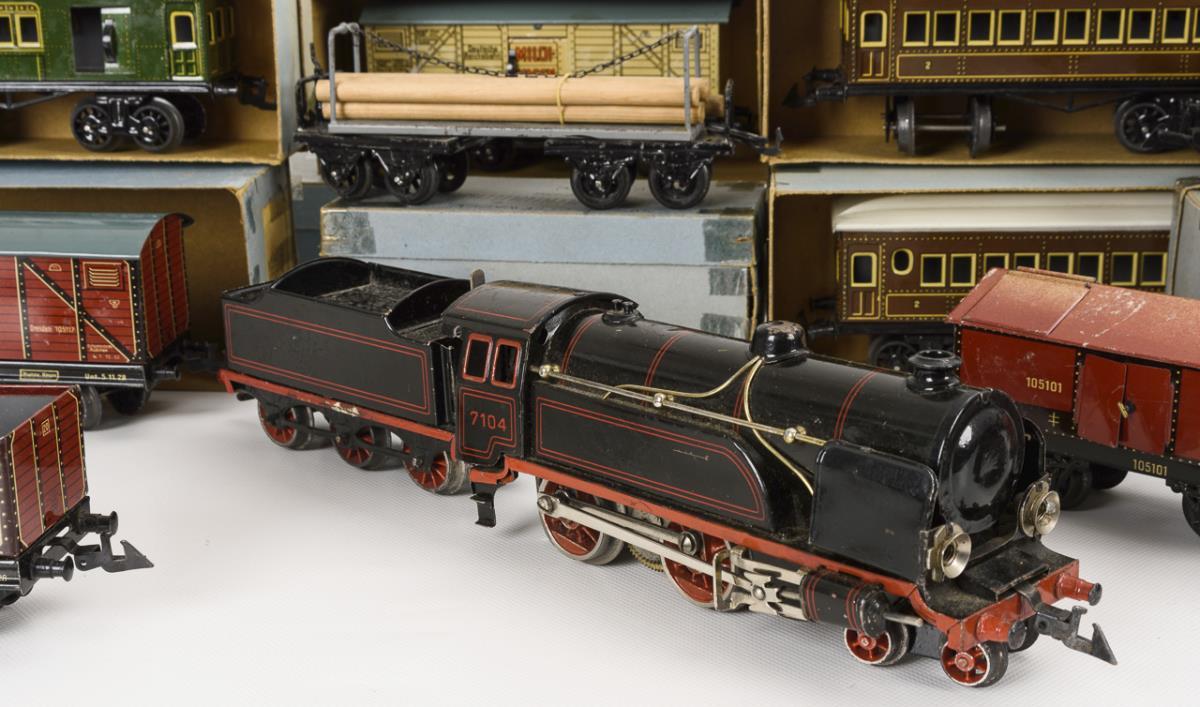Spur 0. Lok "7104" mit Tender, 10 verschiedene Wagen und Schienen. Dazu Trafo, Brücke, 35 gerade Schienen, 24 gebogene Schienen, 3 Weichen und 15 kleine Verbindungen. Als Zugabe Zigarrenkiste mit Märklin-Glühbirnen und alten Kabeln. Altersspuren, kleine Defekte. Funktion nicht geprüft.