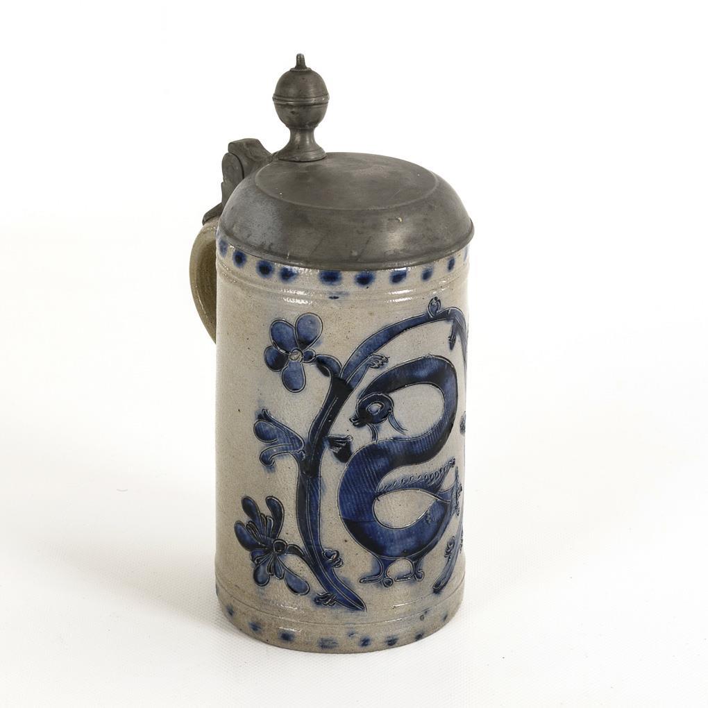 Zylinderform mit ausgestrichenem Bandhenkel. Ritzdekor mit zentralem Vogelmotiv und Blattrankenbogen, Pünktchendekor. Gewölbter Zinndeckel mit Kugeldrücker, undeutlich gepunzt, innen Leinenfleck. Leichte Alters- und Gebrauchsspuren.
