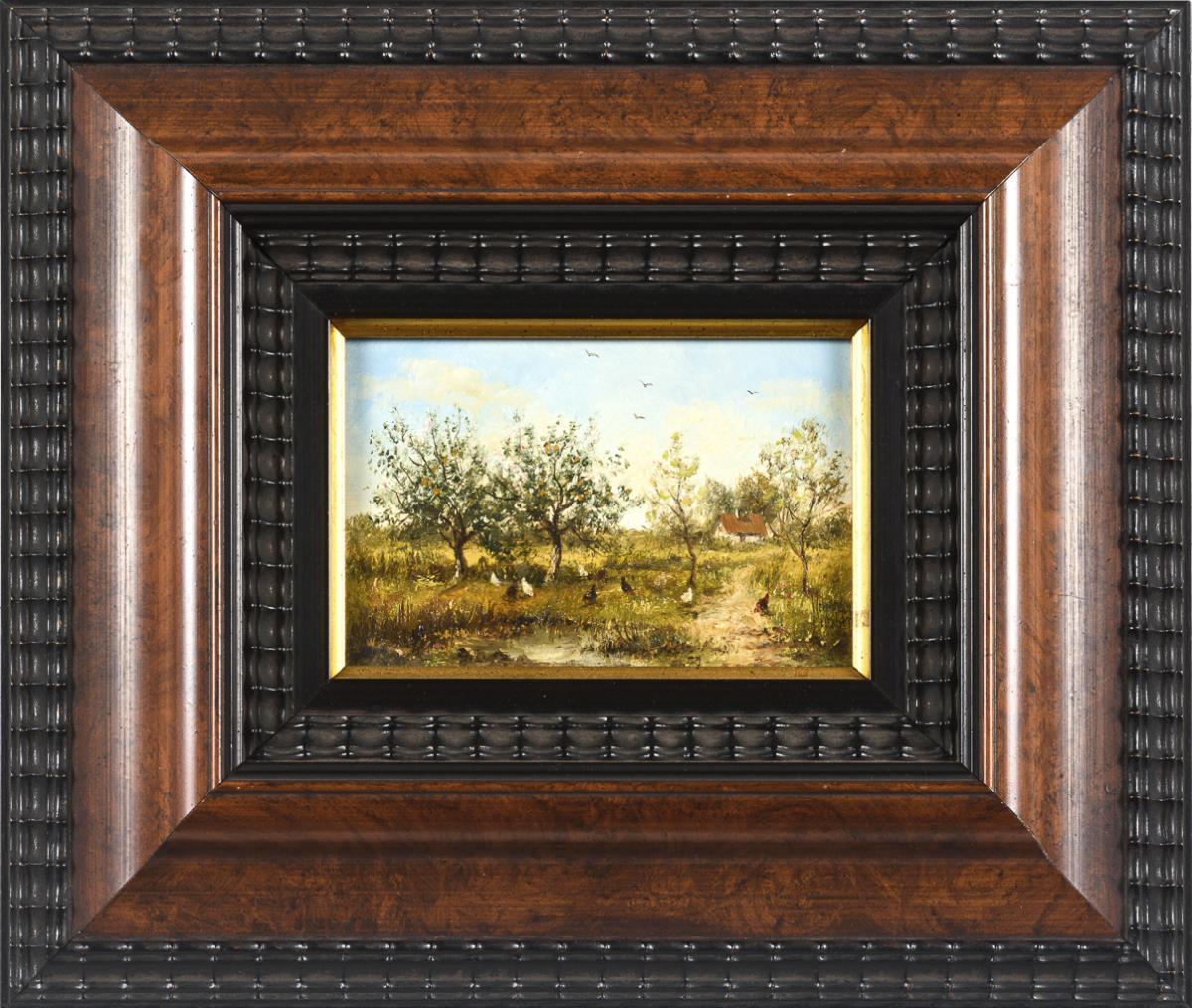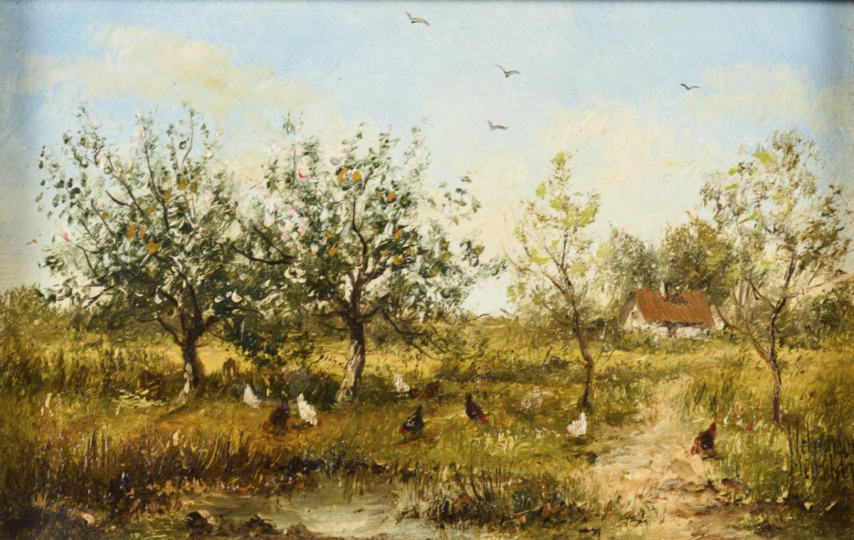 Hühnerschar unter blühenden Obstbäumen nahe dem Bauernhaus.