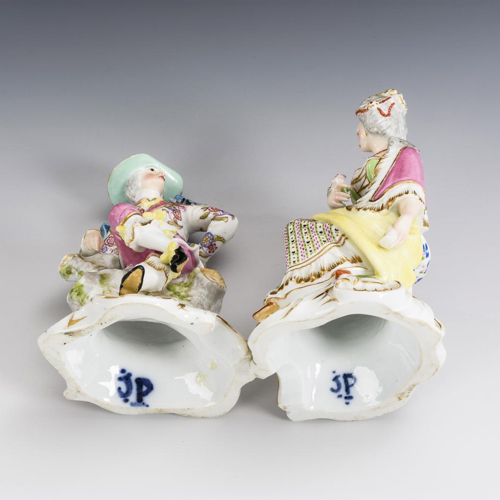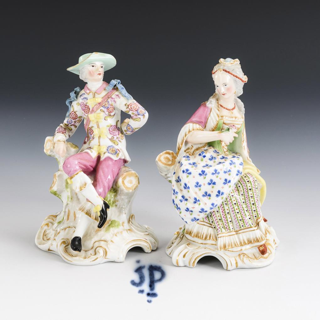 Je auf einem Baumstumpf sitzende Rokoko-Dame mit Rose bzw. ein Rokoko-Kavalier. Rose bestoßen, linker Fuß des Herren und 2 Schleifen restauriert, minimaler Goldabrieb.