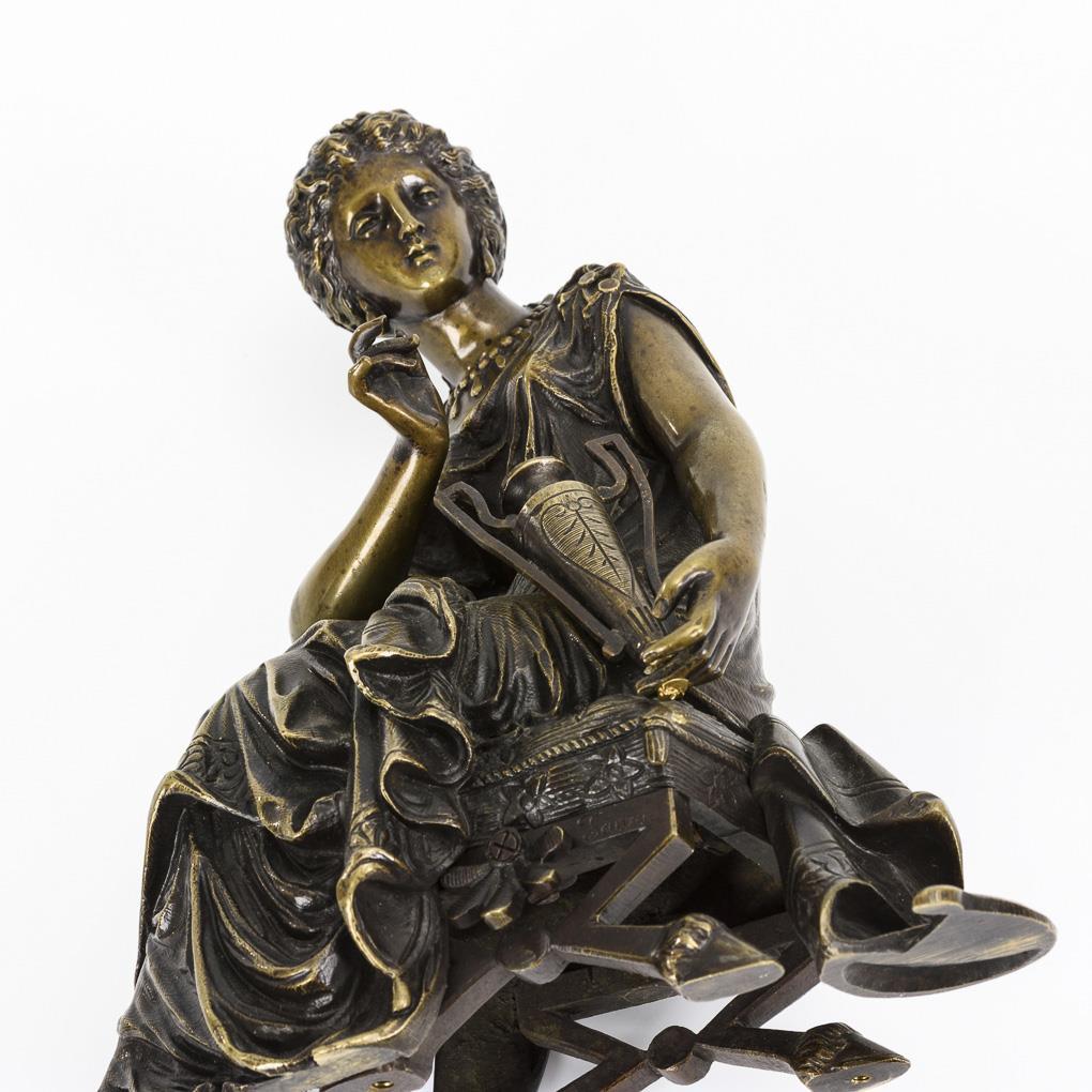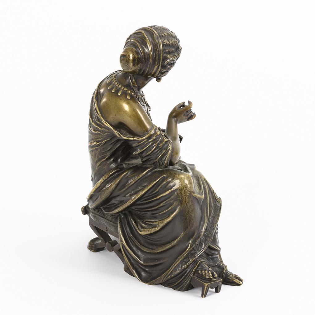 Im langen Gewand auf einem Hocker sitzende Frau mit einer Vase in der Hand. Verschraubung des Armes und der Vase locker, Patina berieben.
