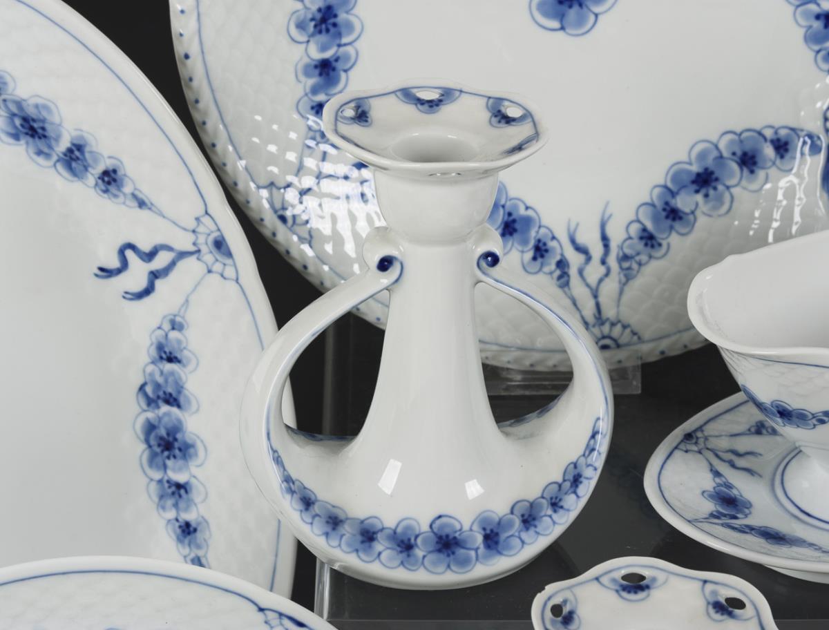 10 Speiseteller, 9 Suppentassen, 9 Salatteller, 4 Kaffeetassen, 1 Untertasse, 1 Kredenzteller, 1 Ovalplatte (L 34 cm), 1 Schale, 1 Schüssel, 1 Sauciere, 2 + 1 Kerzenleuchter (H 13 und 5 cm) und 1 Kompottschälchen. 1 Henkel geklebt, Bestoßung an 6 Tellerrändern, 1 Tassenrand, 1 Suppentassenrand, an beiden Tropftellern der Leuchter, Haarriss in 1 Speiseteller.