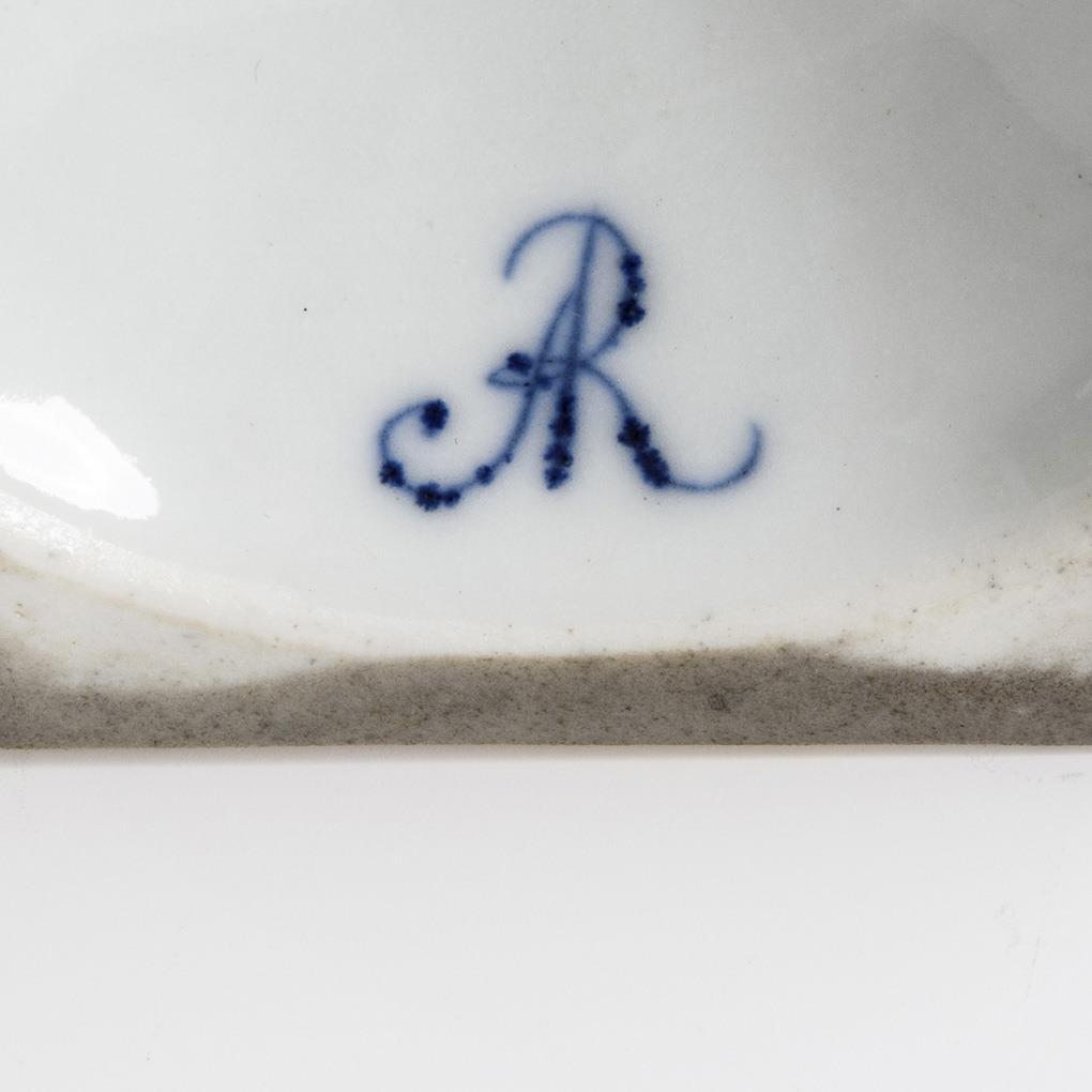 Sechseckiger Leuchter mit mehrfach gegliedertem Schaft. Alternierend angeordnete Felder mit detachierten Röschen vor reicher Goldmalerei und Felder mit Watteaumalerei. Minimaler Goldabrieb.