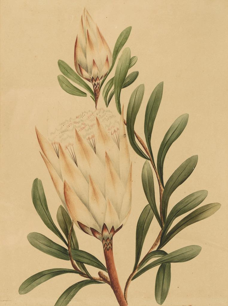 "Prachterika Tafelberg", monogrammiert "E.T.", verso bezeichnet, rechter Rand mit Wasserflecken | Protea - "Zuckerbusch" Südafrika, verso bezeichnet, unterer Rand berieben.