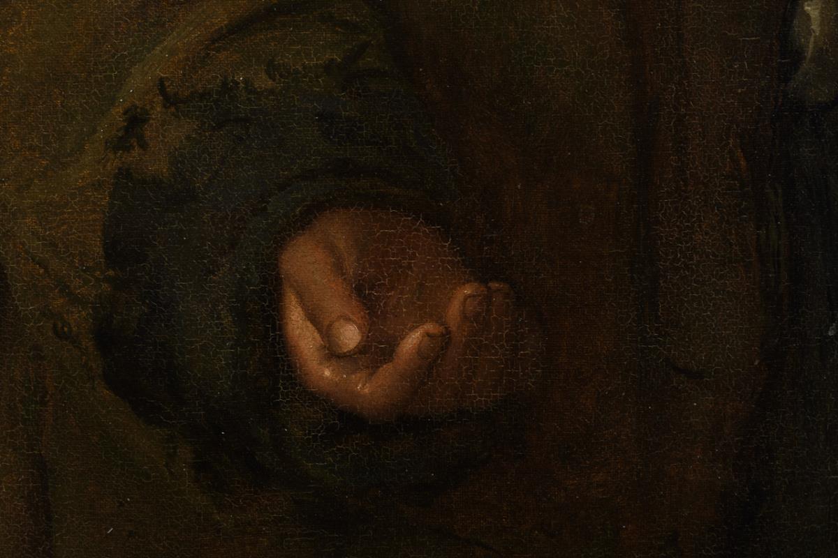 Kleiner Junge in ärmlicher Kleidung, mit aufgehaltener Hand, mit großen Augen den Betrachter anblickend. Altersspuren.