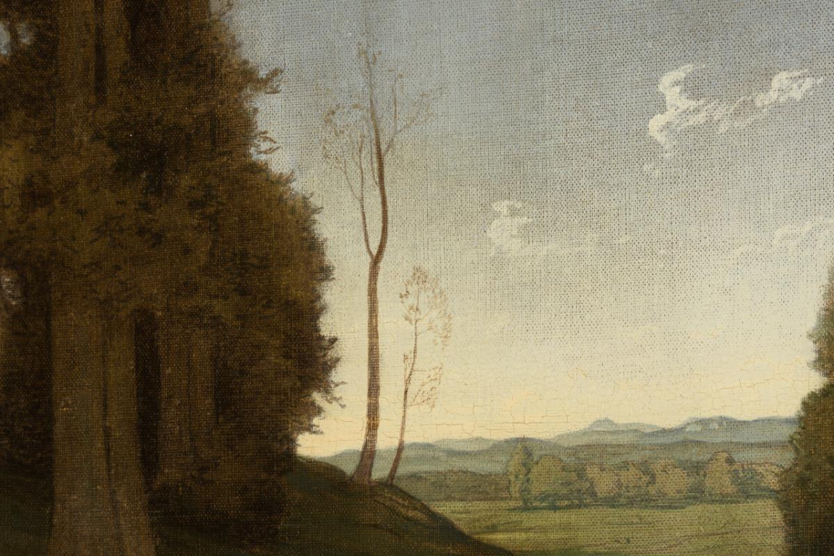 In lasierender Malweise ausgeführte und mit teilweise an Grafiken erinnernde Partien dargestellte weite, ebene Landschaft mit einzelnen Baumgruppen unter einem blauen Himmel. Leichte Altersspuren.