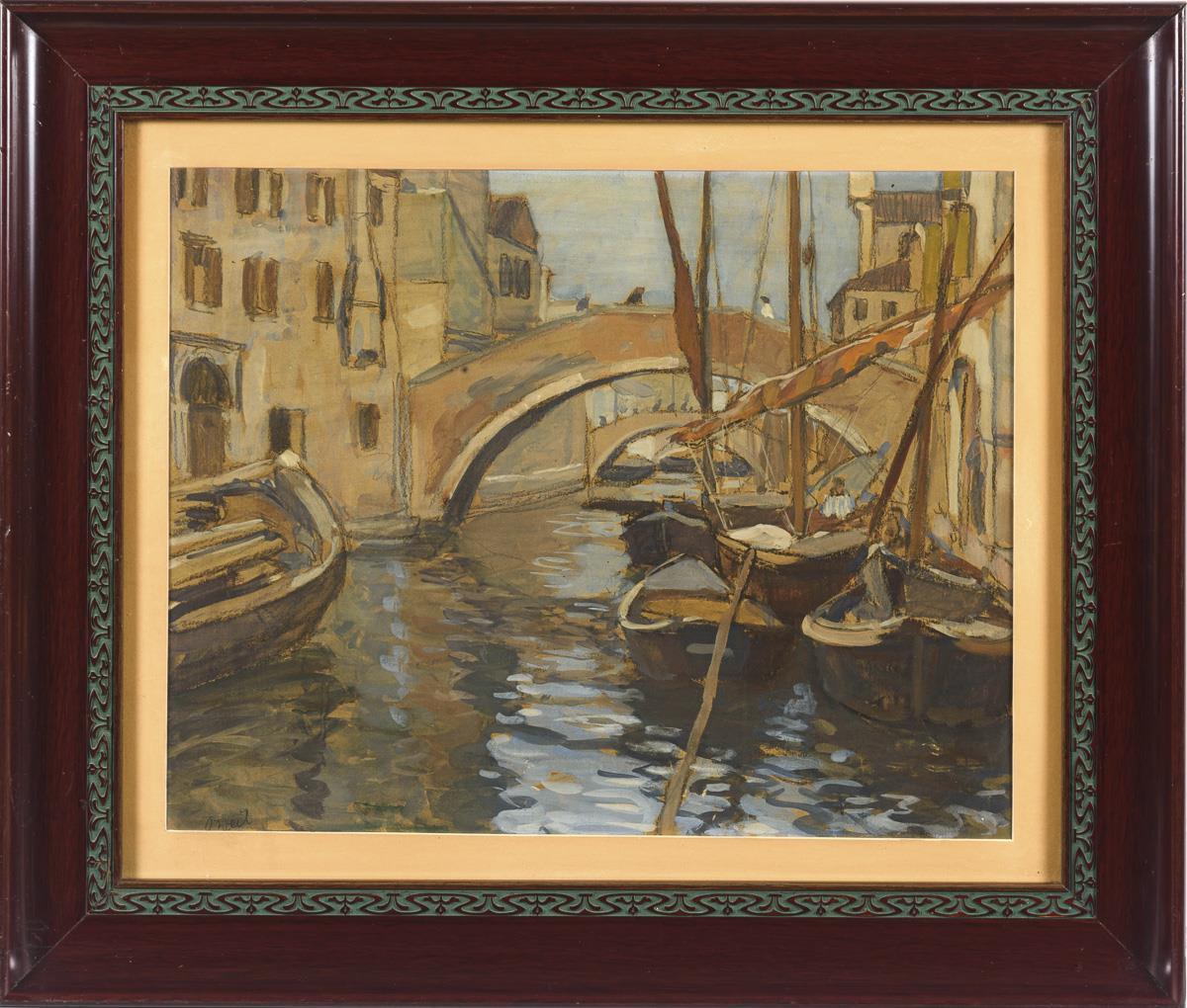 Zahlreiche Segler und Kähne an den Häusern und Blick entlang des Kanales mit einigen Bogenbrücken.