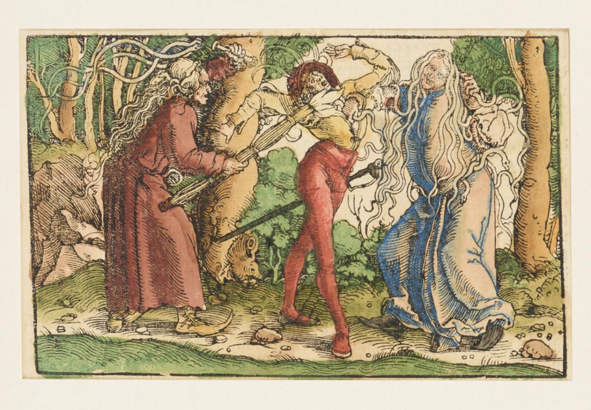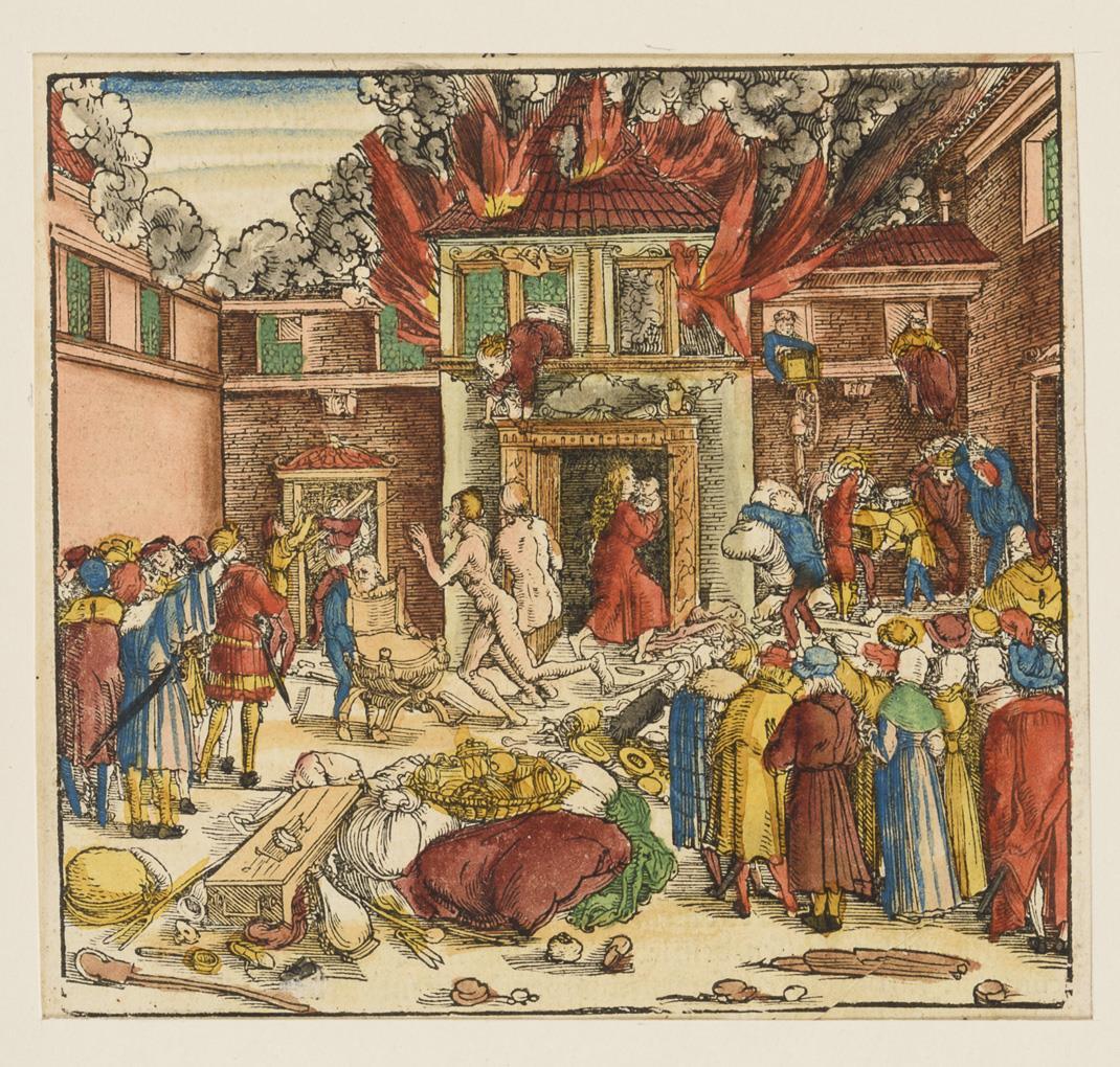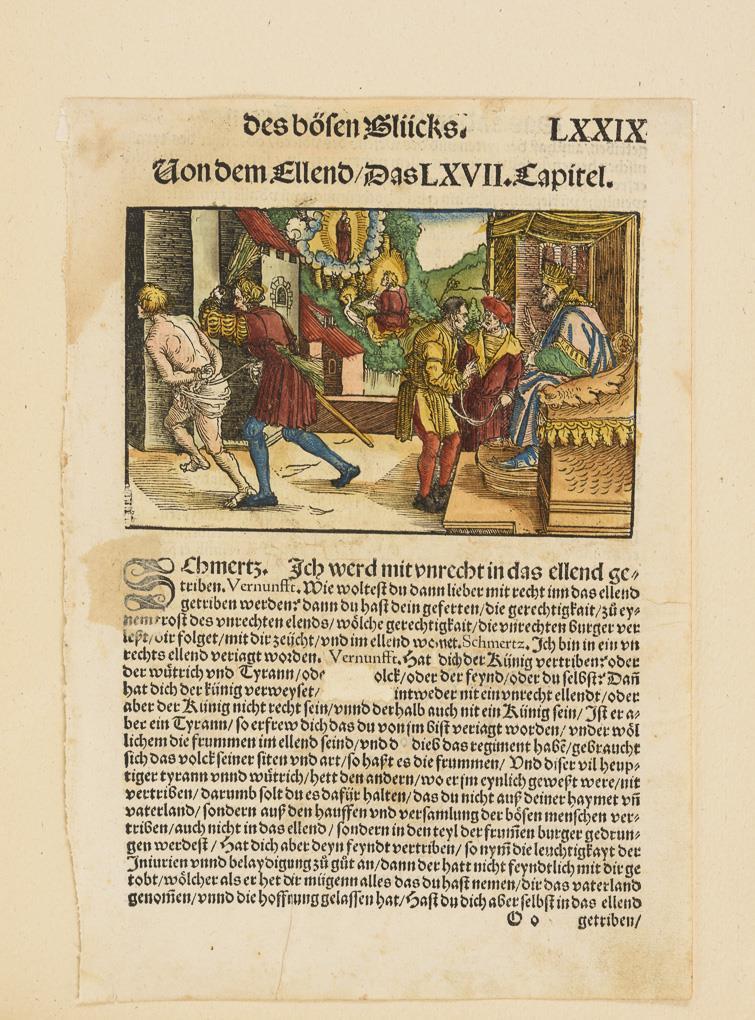 3 Illustrationen aus "Das Ander Buch von Artzney - Des bösen Glücks", 1532: "Vom Brandt/Das VV. Capitel" | "Von der Unsinnigkeit / Das CXV. Capitel" | "Von dem Ellend / Das LXVII. Capitel", verso mit Text in deutscher Sprache. Teils restauriert und hinterklebt, je mit Wasserflecken.