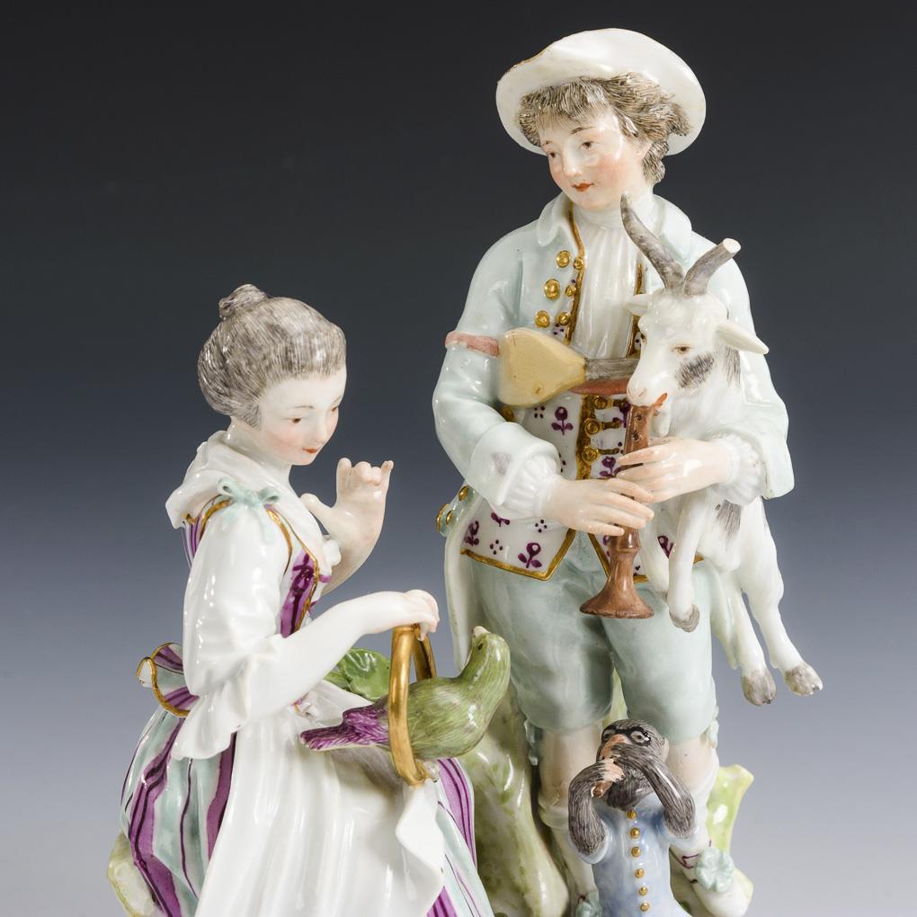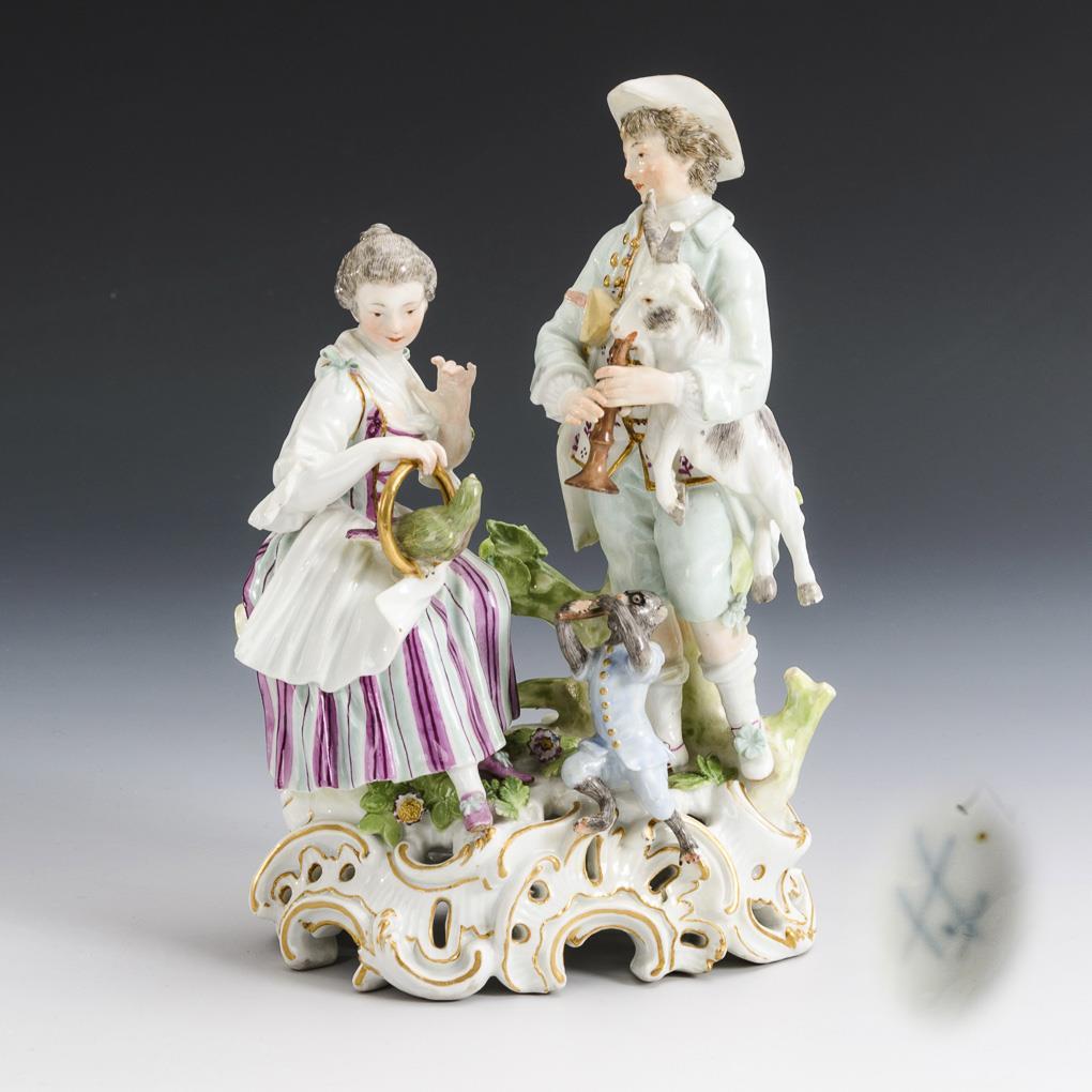 Auf einem durchbrochenen Rocaillesockel sitzende Dame mit Papagei sowie ein Herr mit Dudelsack, zu ihren Füßen ein Affe mit Flöte. Bestoßung am linken Fuß des Affen, am rechten Horn der Dudelsackziege, Flöte, rechter Fuß des Affen und partiell Schleifen restauriert.
