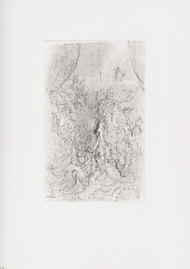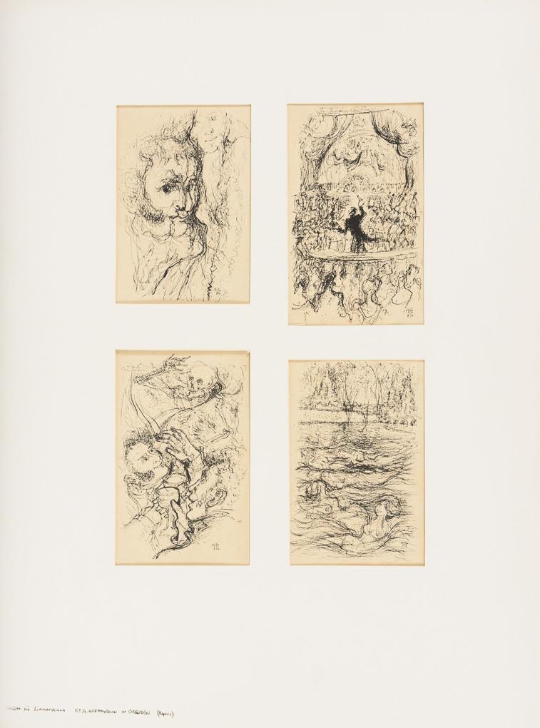 "Welttheater 5", Holzschnitt, Stiftsignatur, Blatt: 36,1 x 25,4 cm, [19]92, oberer Rand mit Klebespuren | "Ecce Homo II", Farbholzschnitt, Stiftsignatur, Blatt: 24,5 x 14 cm, [19]90, beschnitten | Ohne Titel, aquarellierte Lithografie, in der Platte signiert und datiert [19]85, Blatt: 25,5 x 18,2 cm, in den Ecken kleine Löcher durch Wandbefestigung, verso Rand mit Klebespuren | Illustration zu Faust, Lithografie, Blatt: 25,3 x 23,5 cm, in der Platte signiert und datiert [19]81, verso Porträts, in den Ecken kleine Löcher durch Wandbefestigung | "Welttheater", Lichtdruck, Blatt: 32 x 21,3 cm, in der Platte signiert und datiert [19]93, in den Ecken kleine Löcher durch Wandbefestigung, Rand mit Klebespuren | 10 Illustrationen aus Ingo Zimmermanns "Hoffmann in Dresden", 1985 (in 3 Passepartouts montiert) | "Das Kompensationsobjekt", Lithografie, Blatt: 29 x 20 cm, in den Ecken kleine Löcher durch Wandbefestigung, beschnitten.