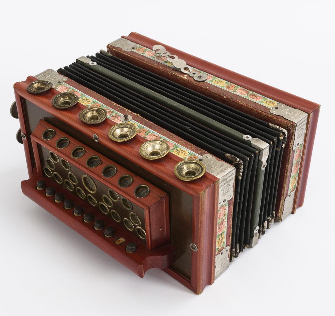 "Gebr. Ludwig's Accordeon, Stahlbronze-Zungen" mit rotem Holzgehäuse. Intakt, 1 Knopf fehlt. / Tennisschläger mit defekter Bespannung. / Kinderspielzeug große Klapper-Walze mit starken Altersspuren