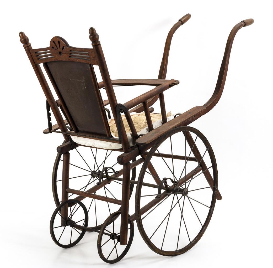 Für größere Puppen und Kinder geeignete Karre, mit 2 großen und 2 kleinen Speichenrädern. Alters- und Gebrauchsspuren, Rückenlehne mit Reparaturspuren, originales Sitzkissen fehlt.